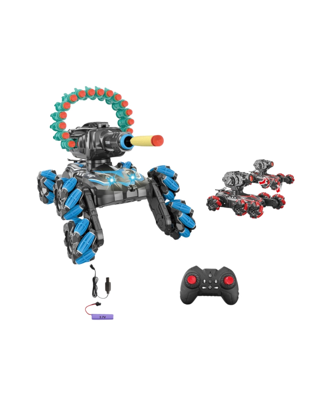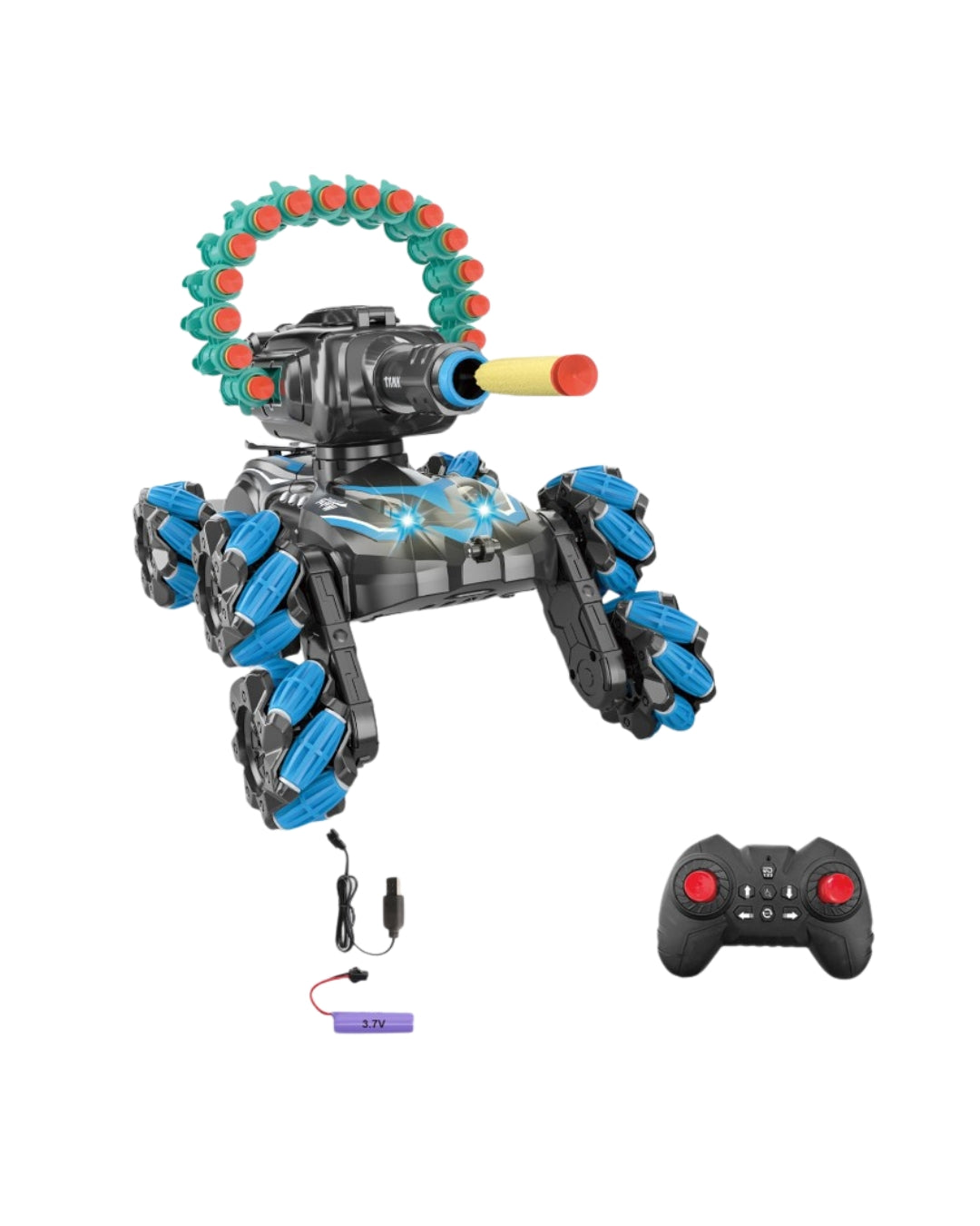 This 2.4GHz remote control stunt tank features roller-traction tires for speed and maneuverability, along with 360-degree rotation and drifting abilities. Equipped with a spray function and the ability to launch soft bullets or water bombs, it provides exciting action for children aged 5 and up.