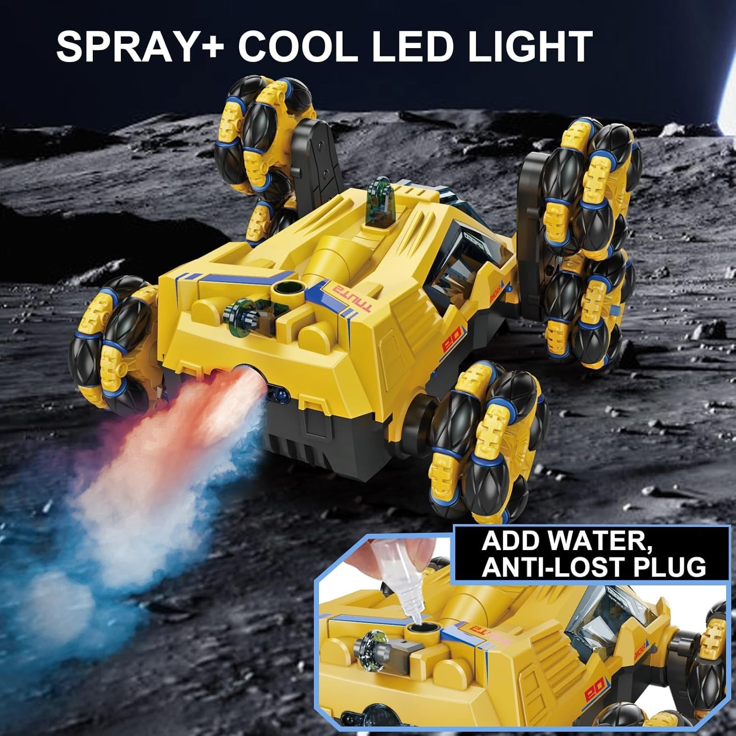 This high-performance remote control car is packed with features that will keep kids entertained for hours. With its 6 cross stunt tires, you can perform amazing tricks and stunts, from 360-degree spins to drifting and crawling. The cool spray design adds an extra element of fun, and the 2.4GHz anti-interference technology allows for multiple cars to race at the same time.