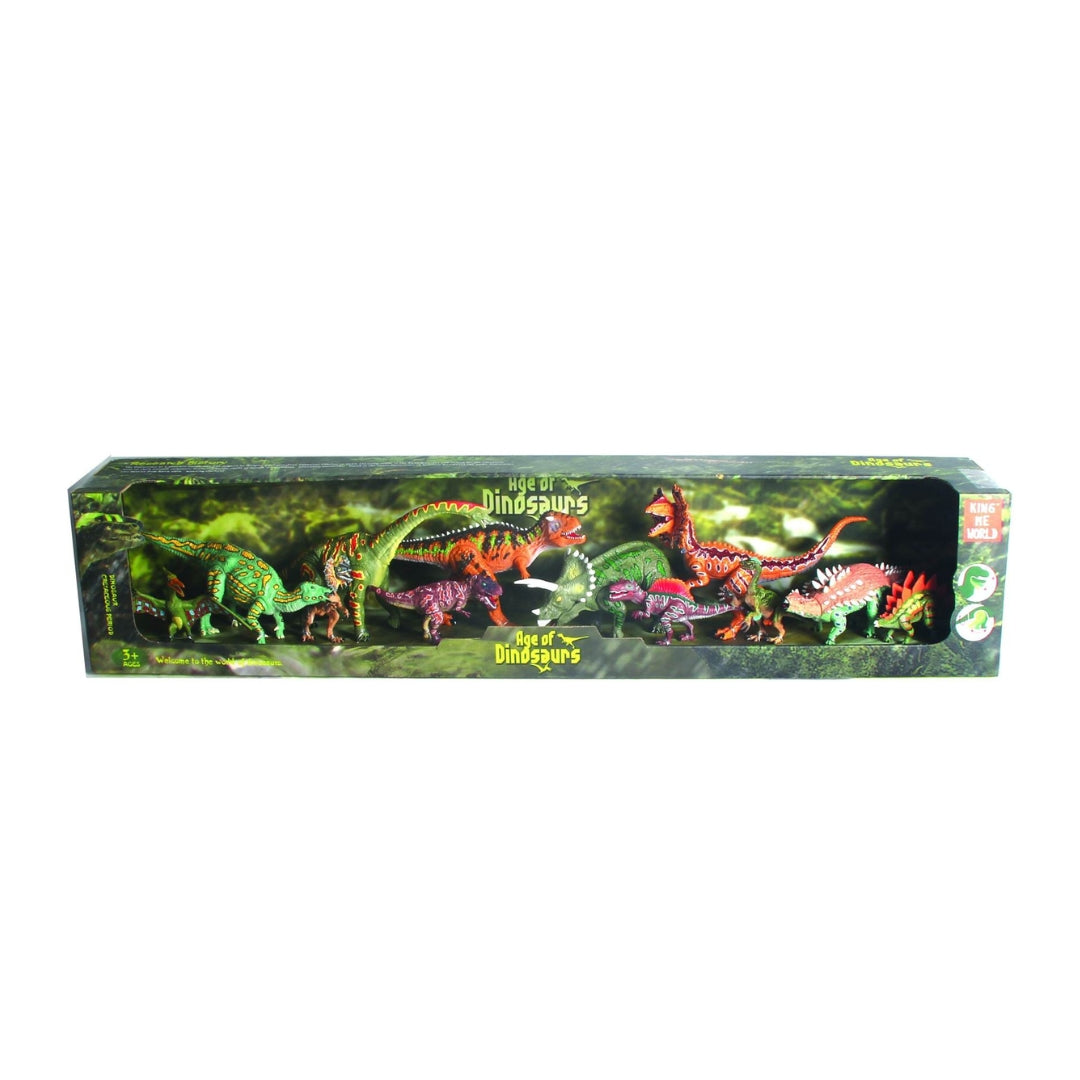 This Age Of Dinosaur set features a vibrant scene with six beautifully designed dinosaur figures, each showcasing unique colors and poses, set against a prehistoric landscape. The set is designed for children aged 4 to 12 years, offering a combination of fun and educational value as they learn about the diverse species that once roamed the earth.