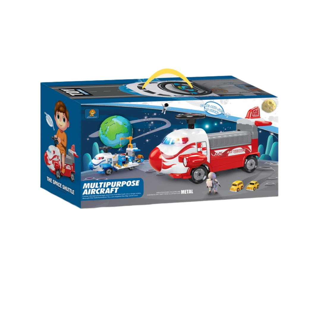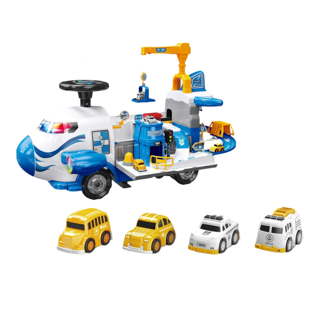 Catering to children aged 2-7 years old, this storage airplane track parking lot lighted musical stroller ride-on toy car offers a delightful and safe play option, boasting a vibrant design stimulating imaginative play, endorsed by top safety standards with EN71 certification, and featuring multiple functions including storage tracks, parking lots, and lighting effects for an engaging and immersive playtime.