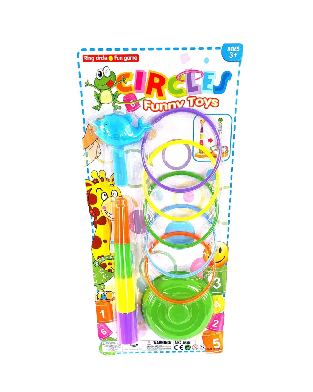 The Animal Toss Game is a vibrant and engaging set featuring colorful rings, a plunger, and a frog character, designed for children aged 3 and above. The set includes a numbered ball for targeting practice, providing a fun and interactive game for young players.