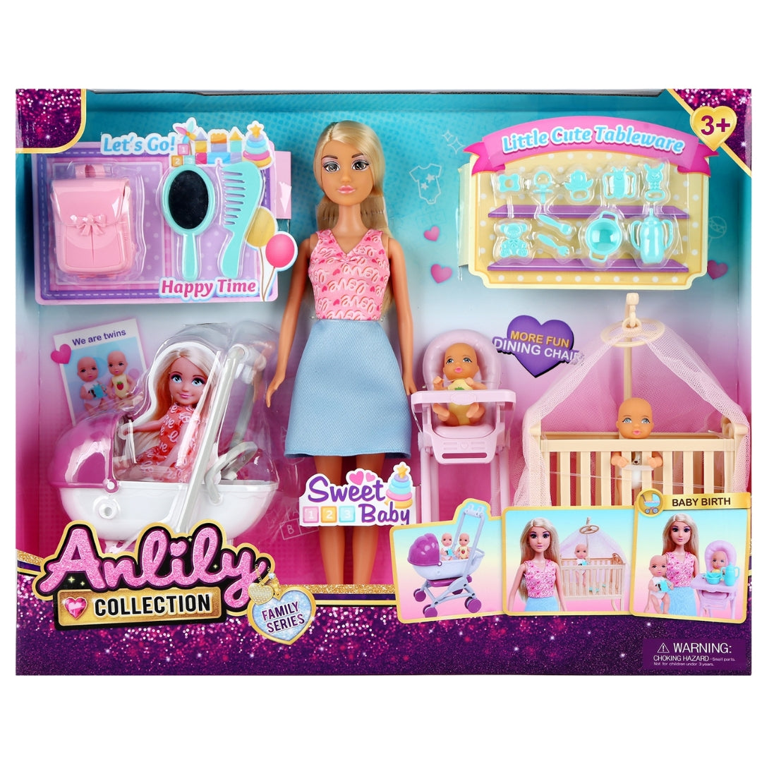 This playset includes a large doll, a baby doll, and accessories such as a baby carriage, high chair, crib, and tableware items. Designed for children aged 3 to 7, it encourages imaginative play and nurturing skills while exploring family and baby care activities like dining and sleeping.