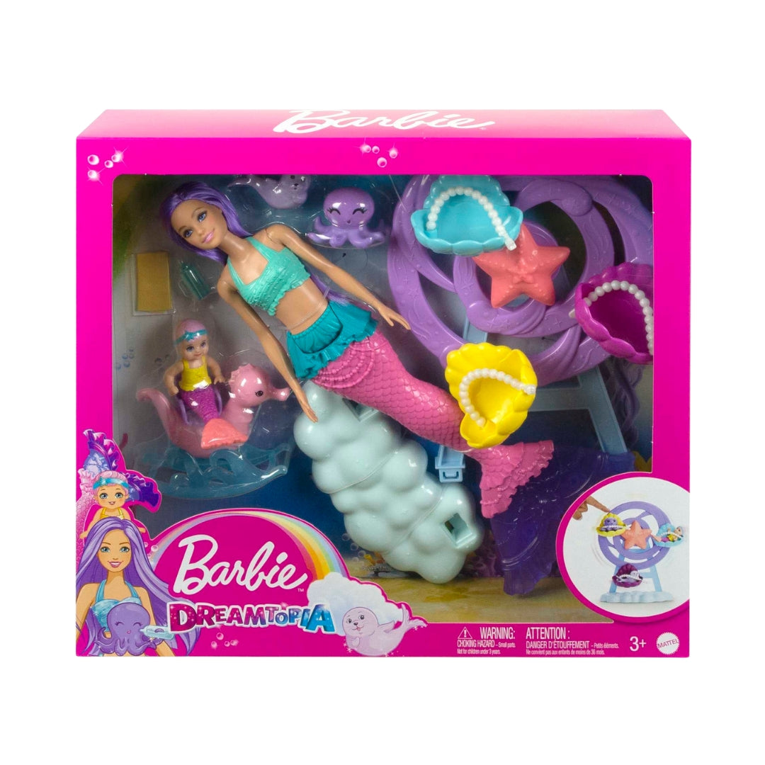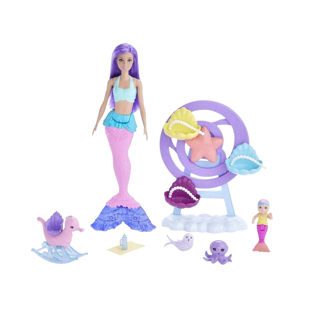 Dive into magical adventures with the Barbie Dreamtopia Mermaid Playset! This enchanting set features a Barbie mermaid doll with straight lavender hair and a shimmering pink-and-purple tail, ready to care for her adorable sea friends a baby mermaid, octopus, and seal. Complete with a Ferris wheel-inspired carousel, rocking seahorse, bottle, and blanket, it inspires endless undersea storytelling fun.