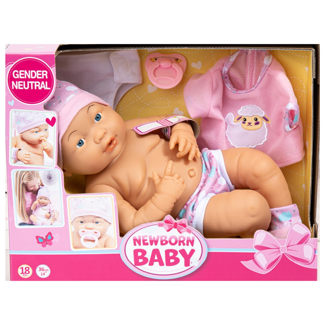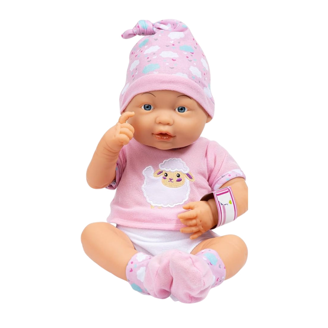 This adorable 36 cm (14 inch) newborn baby doll is beautifully designed with lifelike wrinkles and dimples for an authentic look. Made to be bathable, she’s perfect for hands-on, nurturing play. The set includes a dummy and diaper for first role-playing experiences, plus a charming outfit featuring pants, a jumper, a cap, and shoes, making her ready for all kinds of adventures and care moments.