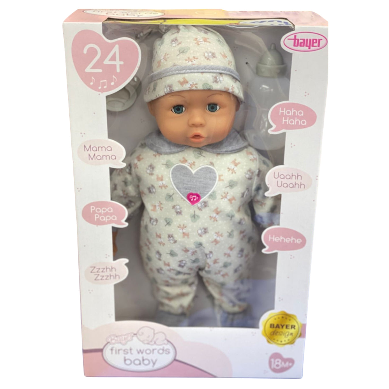The BAYER First Words Baby is a 38 cm doll designed to spark imagination and nurturing play. With a soft cuddly body and lifelike face, she responds with sweet baby sounds and phrases when you press her tummy. Dressed in an adorable outfit, she’s perfect for comforting, role-playing, and bedtime routines.This lovable doll helps develop empathy, communication, and creativity in a fun and caring way.