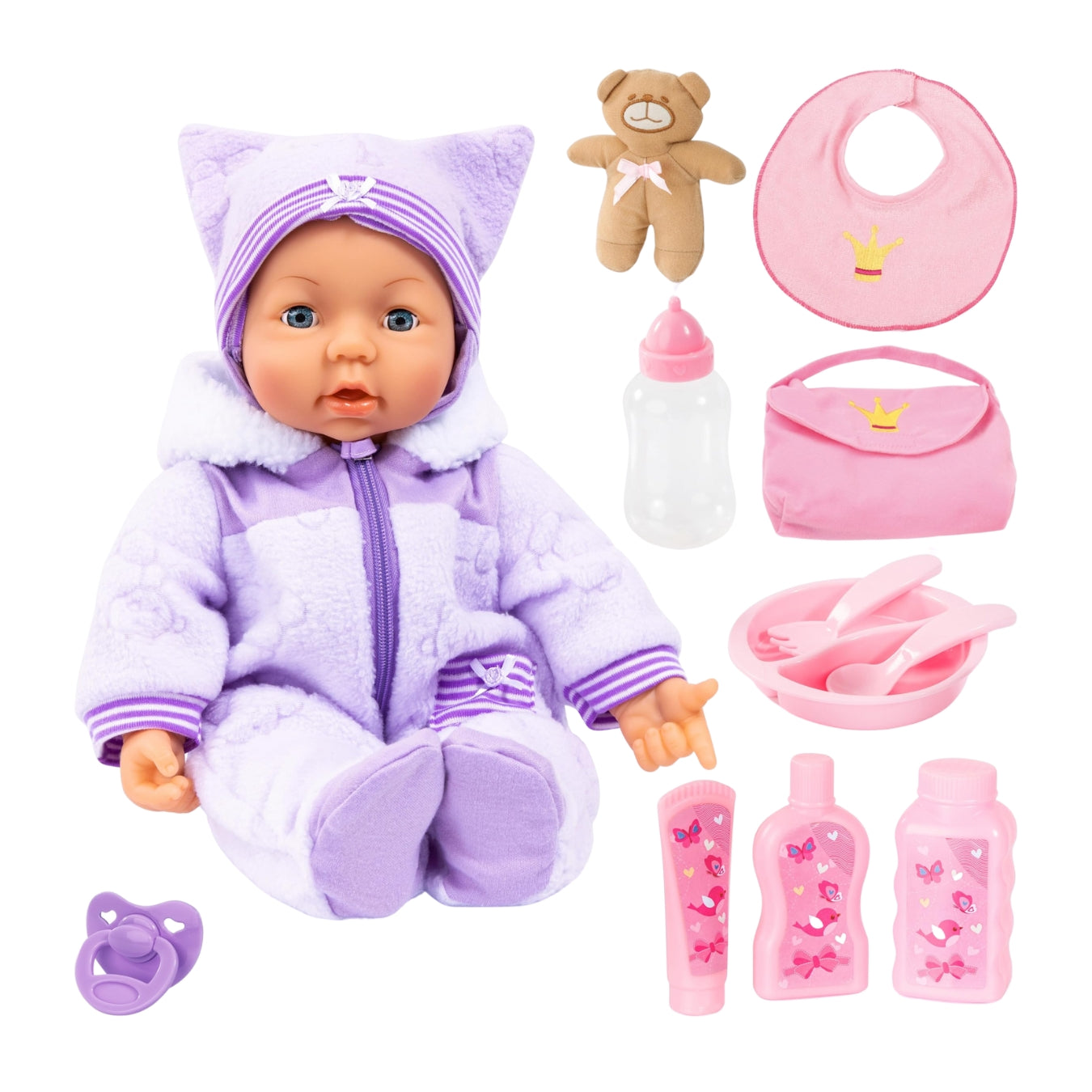 With baby sounds activated by pressing her hands, feet, or tummy, and a full set of accessories—including a bag, bib, bottle, dummy, care bottles, plate, cutlery, and a teddy bear—Piccolina Magic Eyes brings nurturing play to life in the most delightful way. Ideal for little caregivers and endless pretend play fun!