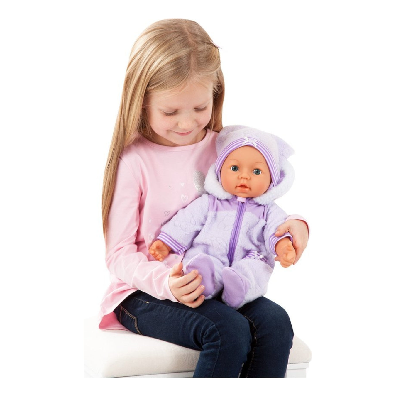 Meet Piccolina Magic Eyes, the perfect companion for cuddles and imaginative play! This 18-inch soft-bodied doll comes dressed in a cozy romper and features interactive magic like blinking eyes, moving mouth, and realistic baby sounds. Press her hand to see her blink or fall asleep, or feed her with the bottle to watch her mouth move and hear cute drinking sounds.