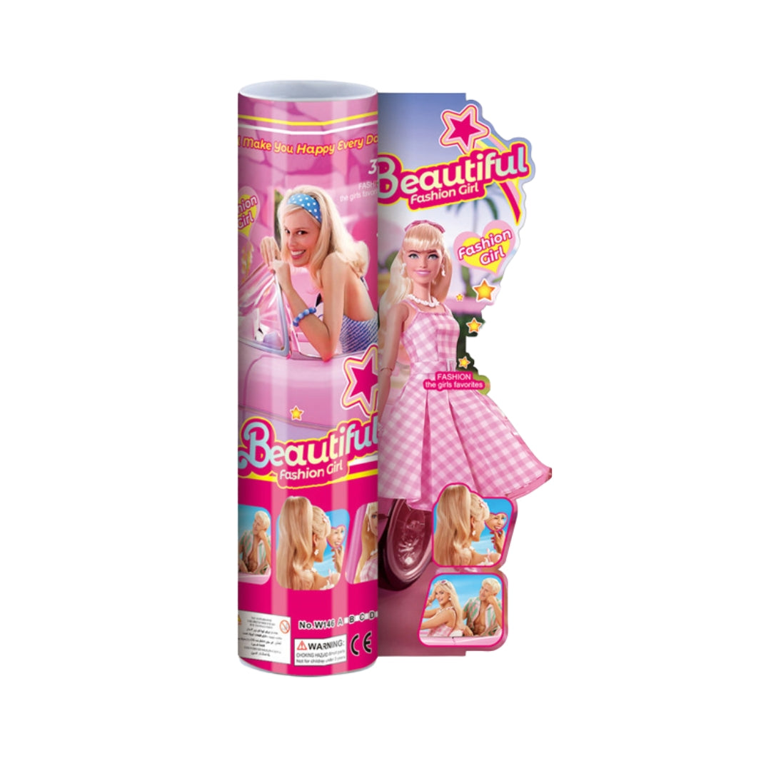The Beautiful Fashion Girl toy features three dolls from the Color Reveal Fashion series, each showcasing a unique outfit. The dolls have blonde hair, blue eyes, and are dressed in stylish pink and blue ensembles with heart-shaped pendants, offering a diverse and fashionable play experience for children.