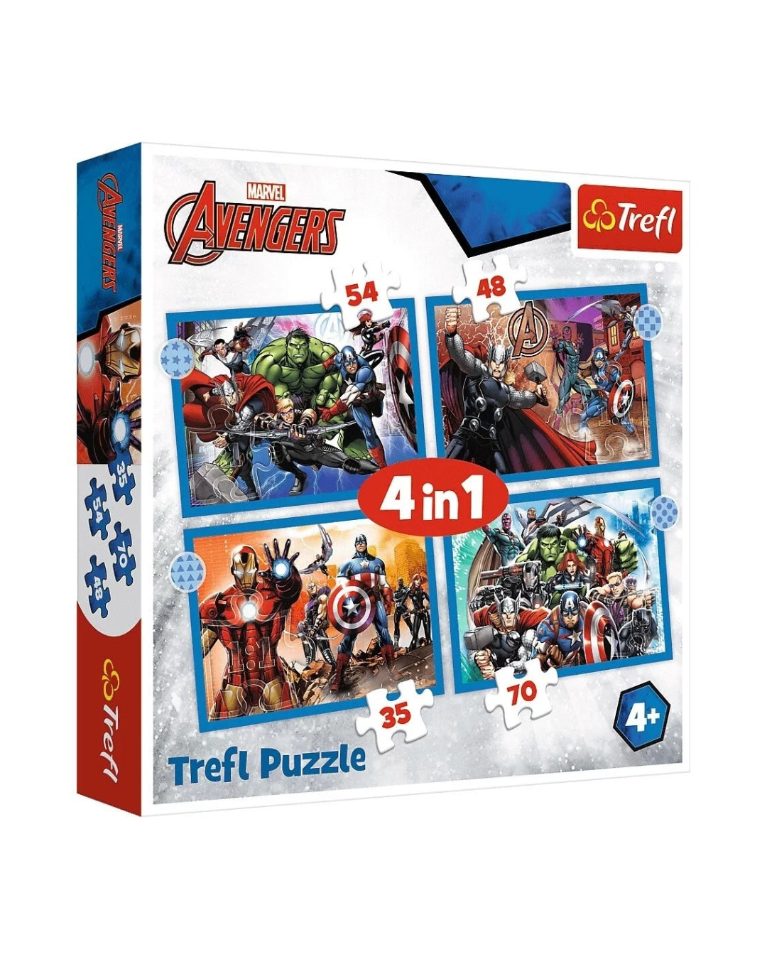 "Brave Avengers" is a children's puzzle set consisting of 4 independent puzzles designed for all Avengers fans, with each completed puzzle creating four images measuring 285 x 205 mm. With varying piece counts of 35, 48, 54, and 70, these puzzles cater to both younger and slightly older puzzle enthusiasts, produced in Poland using eco-friendly materials and suitable for children above 4 years old.