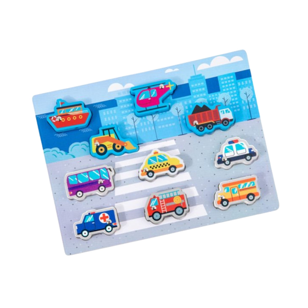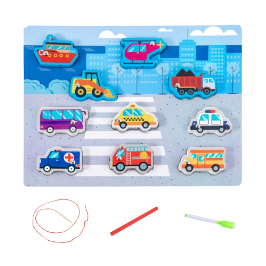 The Car Style Double Sided Multi Function Board is a versatile wooden game designed to engage children with multiple activities. Featuring a reversible puzzle with large, thick pieces, stringing beads, a drawing board, and a magnetic fishing game, it offers endless fun while promoting fine motor skills, creativity, and hand-eye coordination.