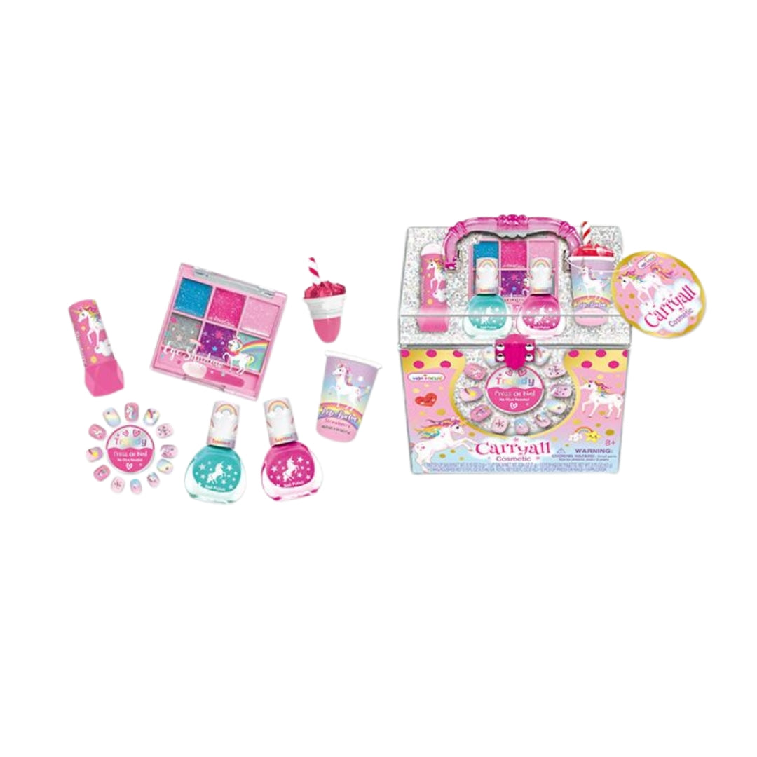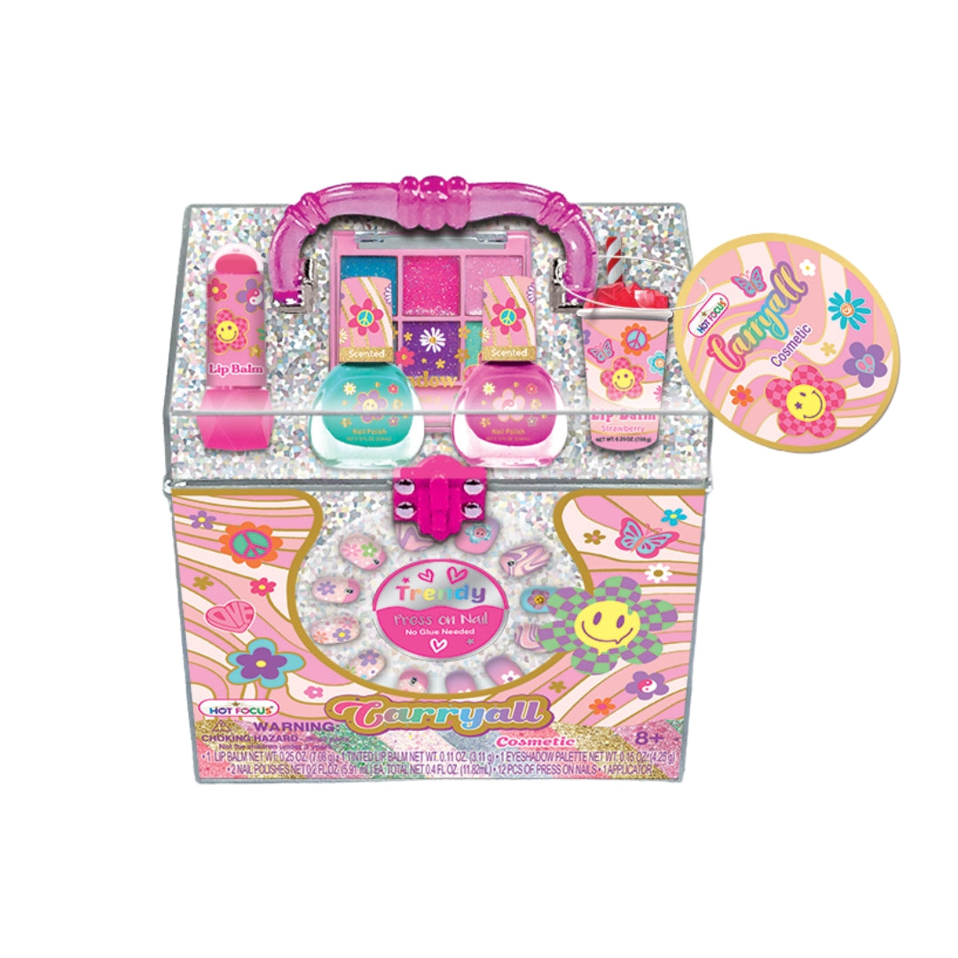 Step into a world of sparkle and imagination with the Carry All Cosmetic - Groovy Flower set! This magical collection lets you unleash your inner fairy with scented cosmetics, press-on nails, and more—all neatly stored in a stylish, reusable acrylic carry case.