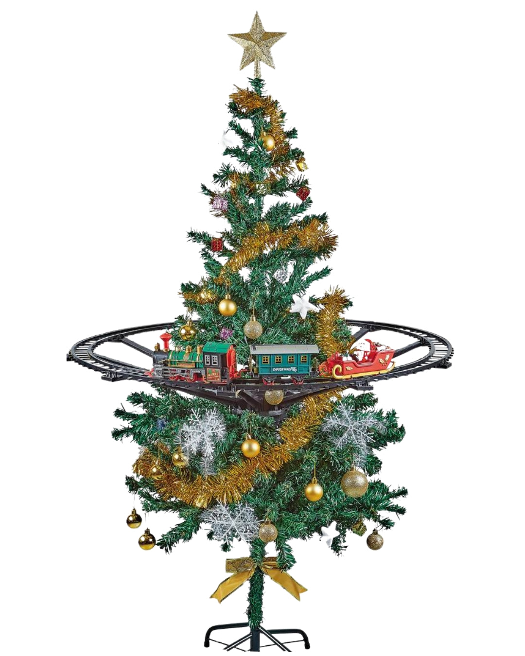This festive Christmas tree train set features lights, sound effects, and 30 durable pieces including a locomotive, carriages, tracks, and a tree-mounting ring. It can be installed around the base of a Christmas tree (88 cm diameter) or set up on the floor, offering easy assembly and fun holiday decoration play.