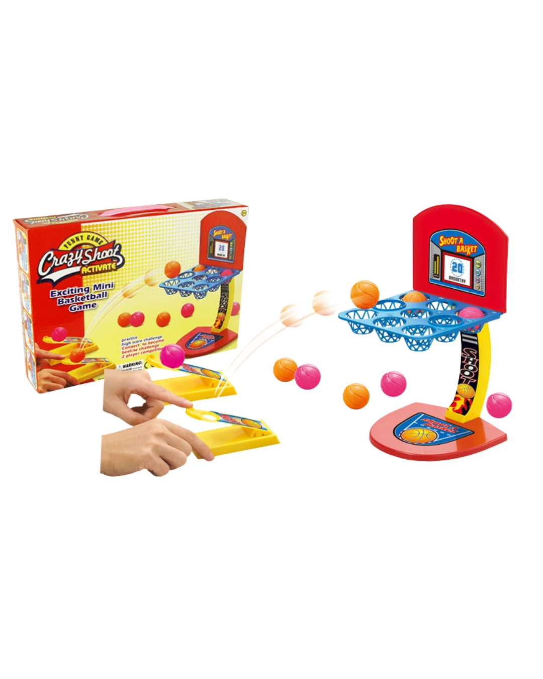The Crazy Shoot mini basketball game is a portable tabletop toy designed for children aged 3 and up, helping develop hand-eye coordination and motor skills. Featuring a finger-powered shooting mechanism, it can be played solo or enjoyed as a fun two-player challenge.