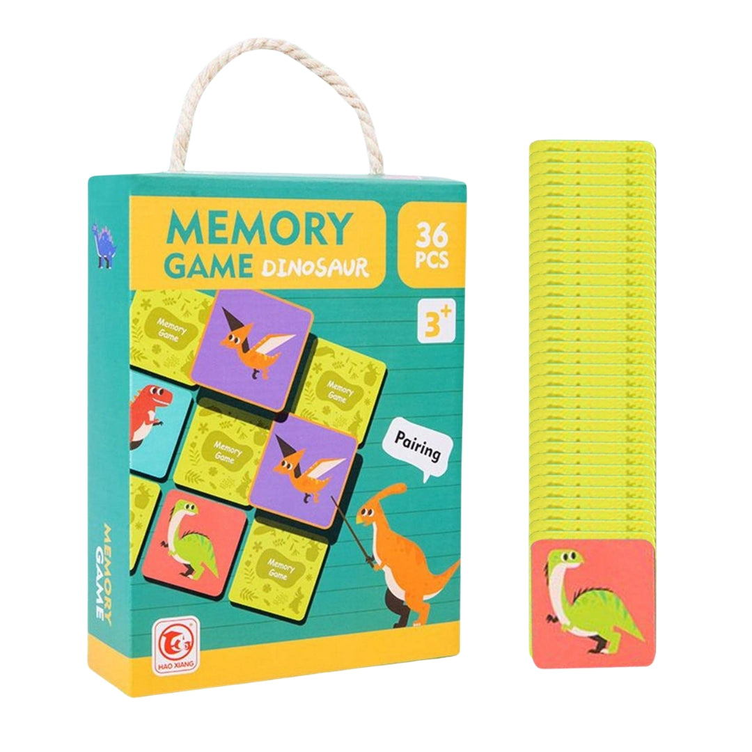 This 36-piece memory game features colorful dinosaur illustrations for fun and engaging matching play. Designed for children aged 3 and up, it helps develop memory, concentration, and cognitive skills.