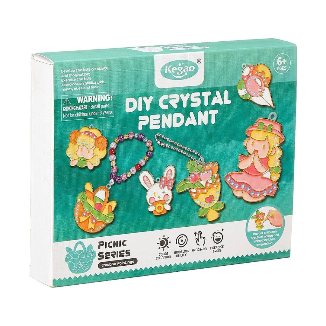 This DIY Crystal Pendant kit is part of the Picnic Series by Kegao, designed for children aged 6 and above to develop their creativity and imagination through colorful painting designs featuring musical notes, teddy bears, and butterflies, aimed at enhancing hand-eye coordination, modeling ability, color coordination, and brain exercise.