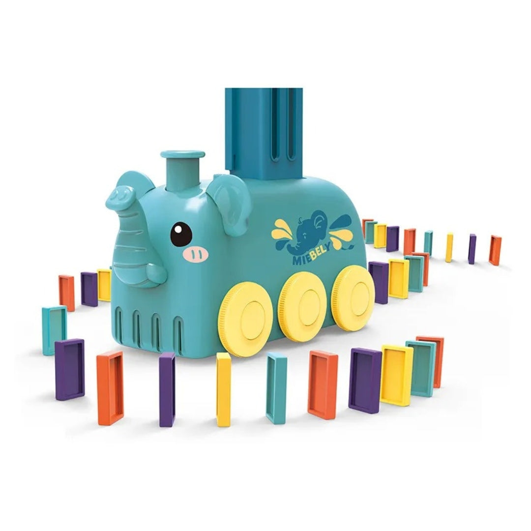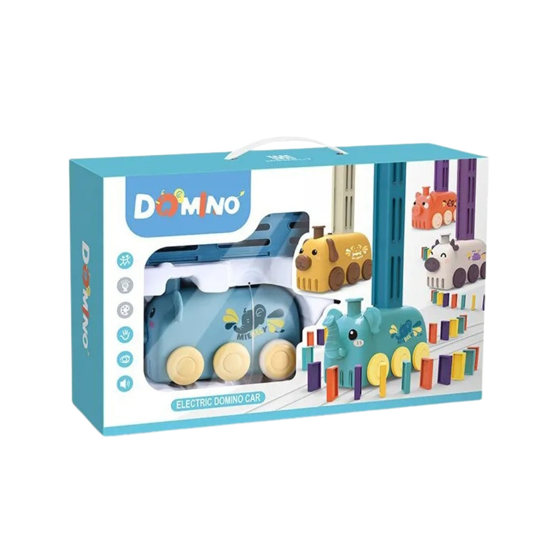 Presenting the Electric Domino Building Blocks Toy Car Set, suitable for children aged 3 and above, crafted from eco-friendly ABS plastic, featuring automatic domino falling action, packaged in a colorful box, with gameplay involving loading dominoes into the storage box, inserting it atop the train, installing 2 AA batteries, switching on the train to witness automatic domino placement at the rear.