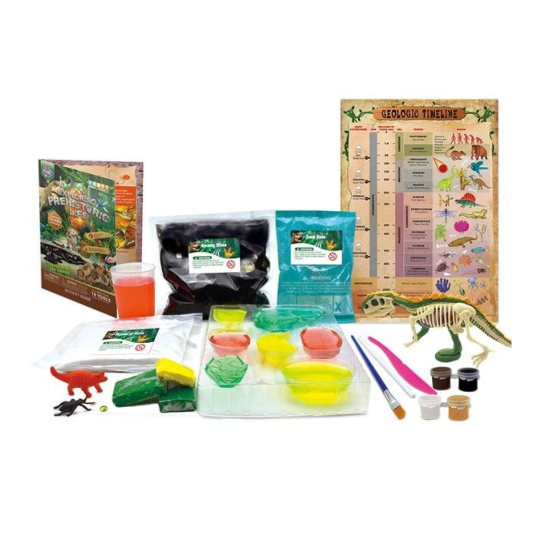 Science Toys has curated the Exploring Prehistoric Life Toys Set for children, offering a hands-on exploration of dinosaur structures, DIY dinosaur creation, amber formation investigation, and excavation of diverse prehistoric fossils, fostering engaging prehistoric discovery activities for kids. This science experiment kit provides a range of archaeological exploration activities, including realistic dinosaur and prehistoric fossils, play dough, prehistoric plant and animal models, insect "amber" soap molds, and accessories, immersing children in a unique prehistoric world while enhancing logical thinking, hands-on skills, and observation abilities, all while experiencing the wonders of science in an entertaining manner. Compliant with EU and US toy safety standards, this high-quality, safe, and eco-friendly set, crafted from edible-grade materials, is imbued with scientific knowledge and educational concepts, empowering children to construct their own "Jurassic Park" at home and revel in the fun and delight of prehistoric civilization.