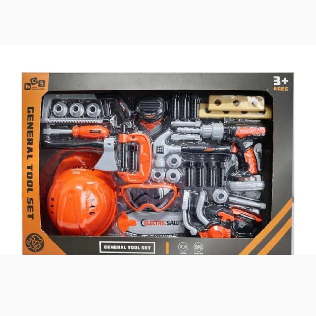 All the tools have a realistic appearance. The screwdriver and chainsaw are battery-powered. The set contains 31 items: screwdriver/drill, chainsaw, helmet, roulette, stationery knife, adjustable wrench, safety glasses, respirator, screwdriver, axe, pliers, drill/screwdriver attachments, bolts and nuts, and auxiliary accessories.