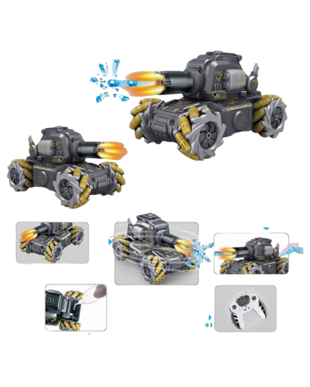 This remote-control Glitter Tank Mecha features 4WD power and a 2.4G controller for smooth handling and stunt performance. It offers omnidirectional movement, 360-degree rotation, precision shooting with water beads, and sound and light effects for an immersive play experience.