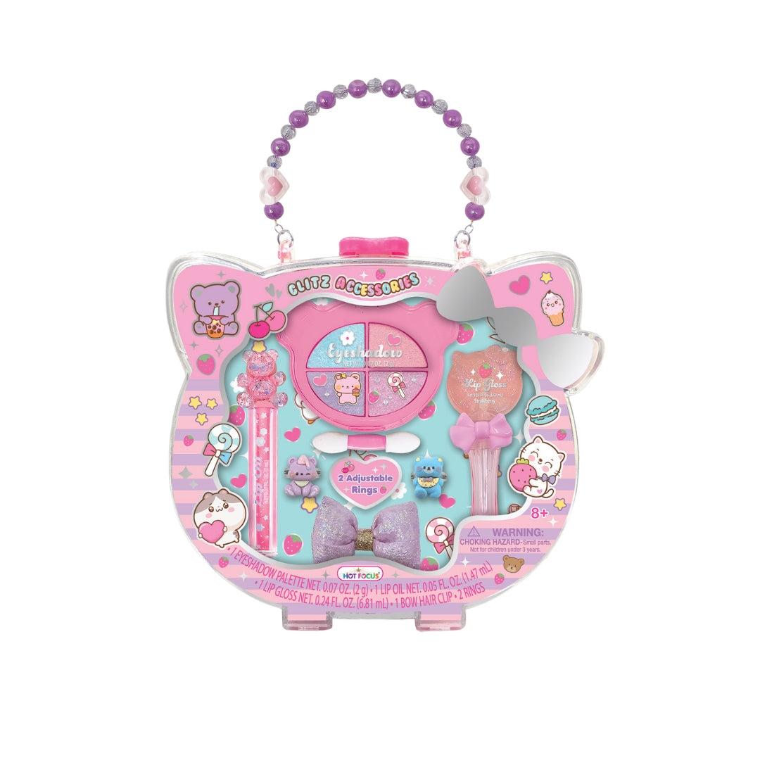 Add a touch of sparkle and fun with the Glitz Beauty Critters Set! This adorable beauty kit includes a colorful eyeshadow palette, two shimmering lip glosses, and two cute adjustable rings—perfect for young glam lovers who enjoy playful, creative looks. With charming critter-themed designs, it’s a fun way for kids to express their style and imagination.