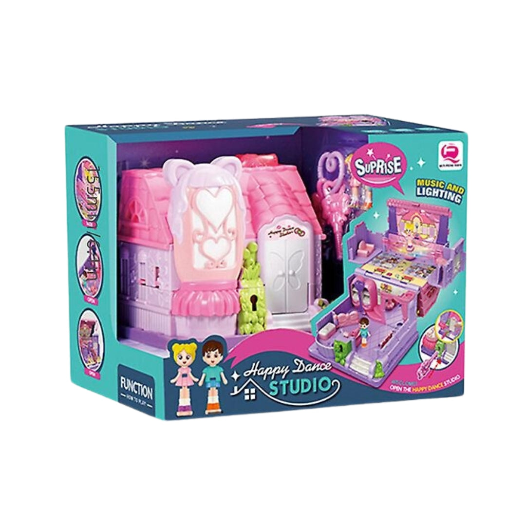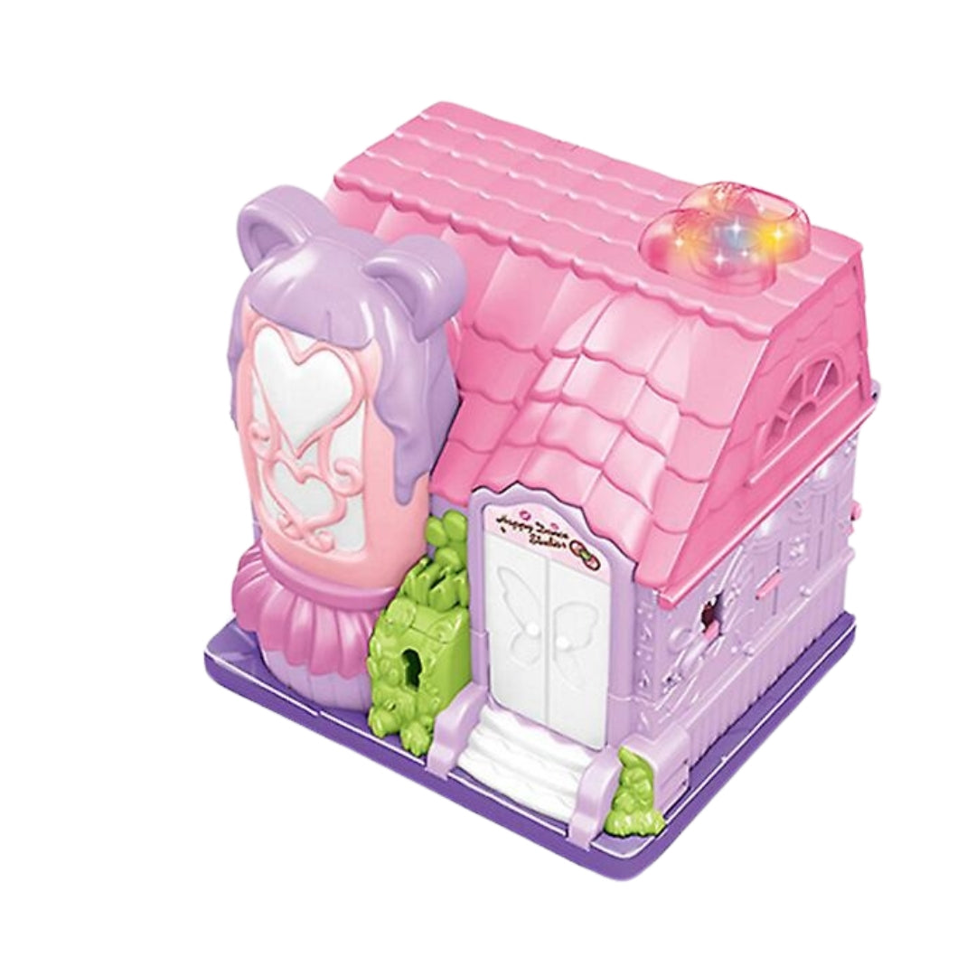 The dollhouse website features a safe and premium construction using BPA-free, non-toxic ABS plastic, promoting DIY building for girls to enhance critical reasoning and a sense of accomplishment, with colorful lights provided by button batteries for a fairy tale ambiance, and a portable pink dollhouse including a doll, music, and lighting functions.