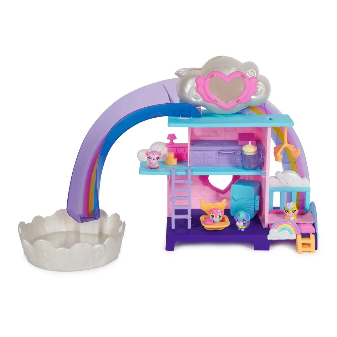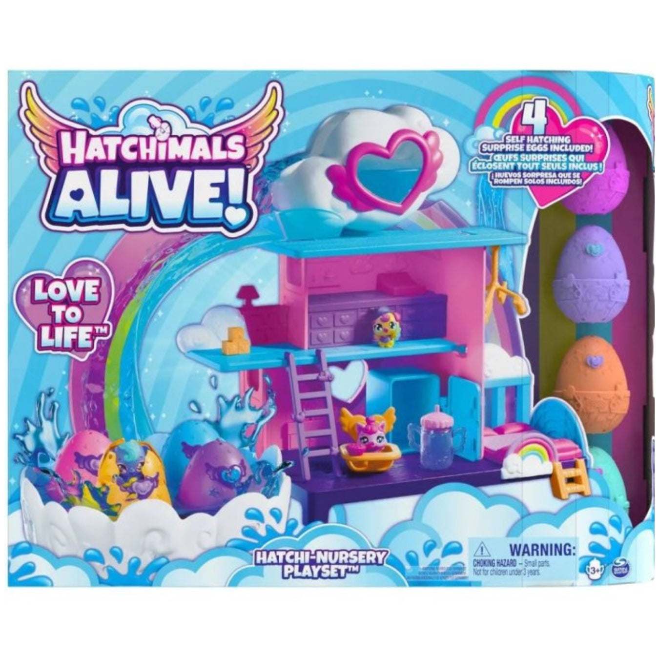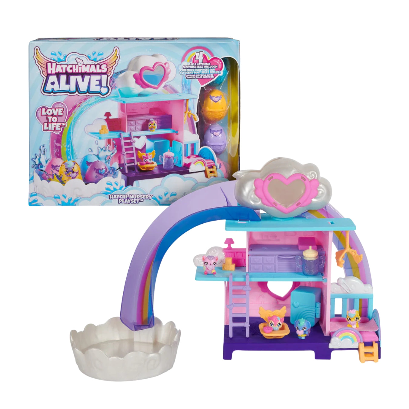 Bring the magic of Hatchimals Alive to life with the Hatchi-Nursery Playset! This enchanting playset features a multi-hatch pool with four self-hatching eggs that crack open when activated by water. Simply place the eggs in the pool, remove the pacifiers, fill the cloud with water, and tilt it down the rainbow slide to watch your Hatchimals hatch in seconds!