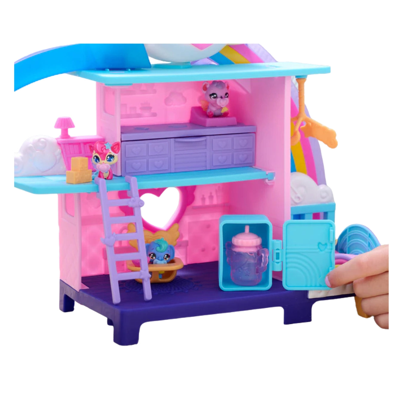 Explore the Hatchi-Nursery with 13 fun accessories—feed your Hatchimals in the booster seat, climb up to the playroom for imaginative block play, slide down the rainbow slide, or tuck them in for naptime. The playset encourages hours of nurturing and creative fun.