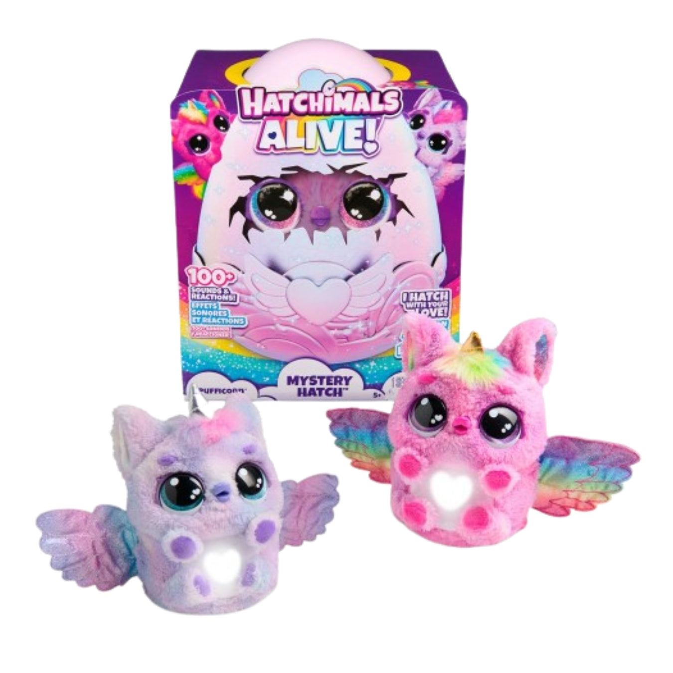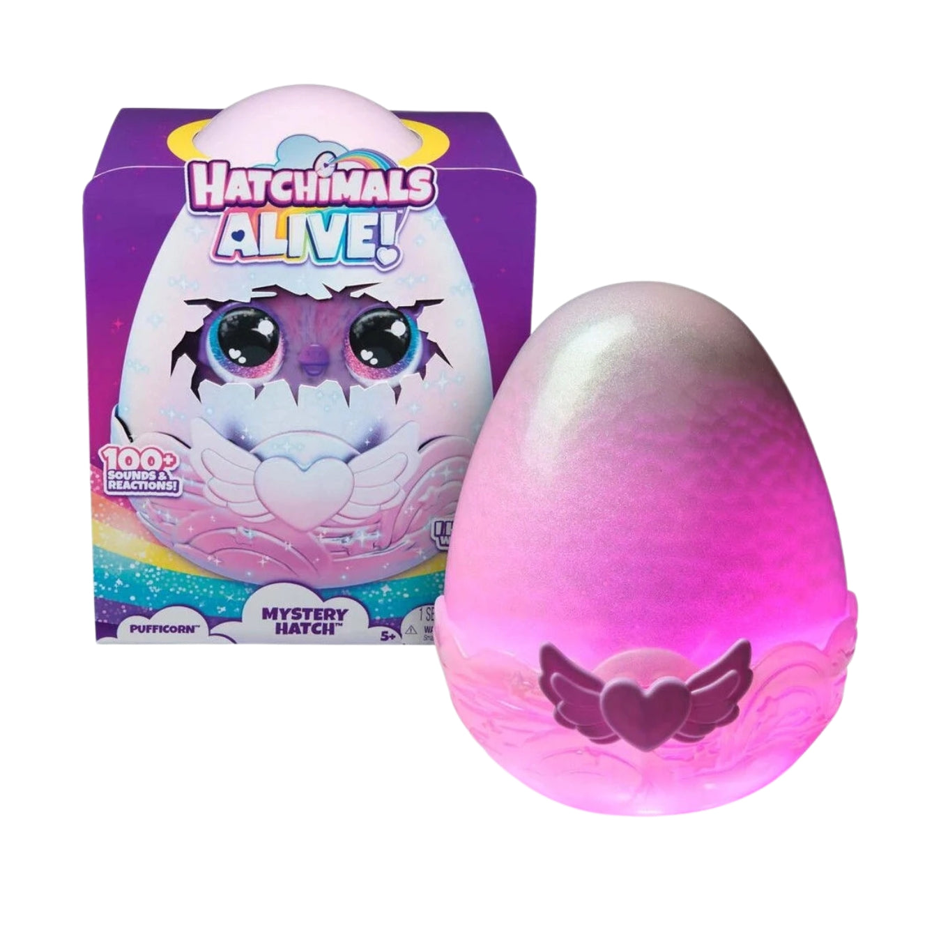 Experience the wonder of Hatchimals Alive with the Mystery Hatch Pufficorn! This interactive surprise toy features a unique egg that hatches to reveal a cuddly Pufficorn surrounded by a magical mist, lights, and sounds. Each Pufficorn is a delightful surprise, making every unboxing a special moment.