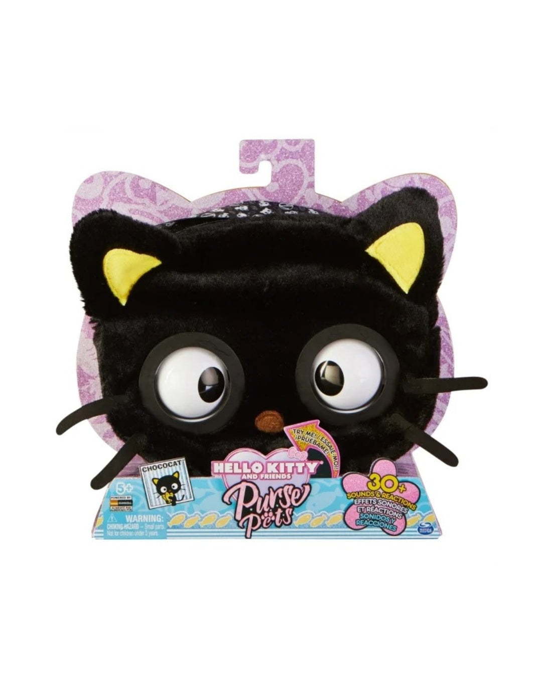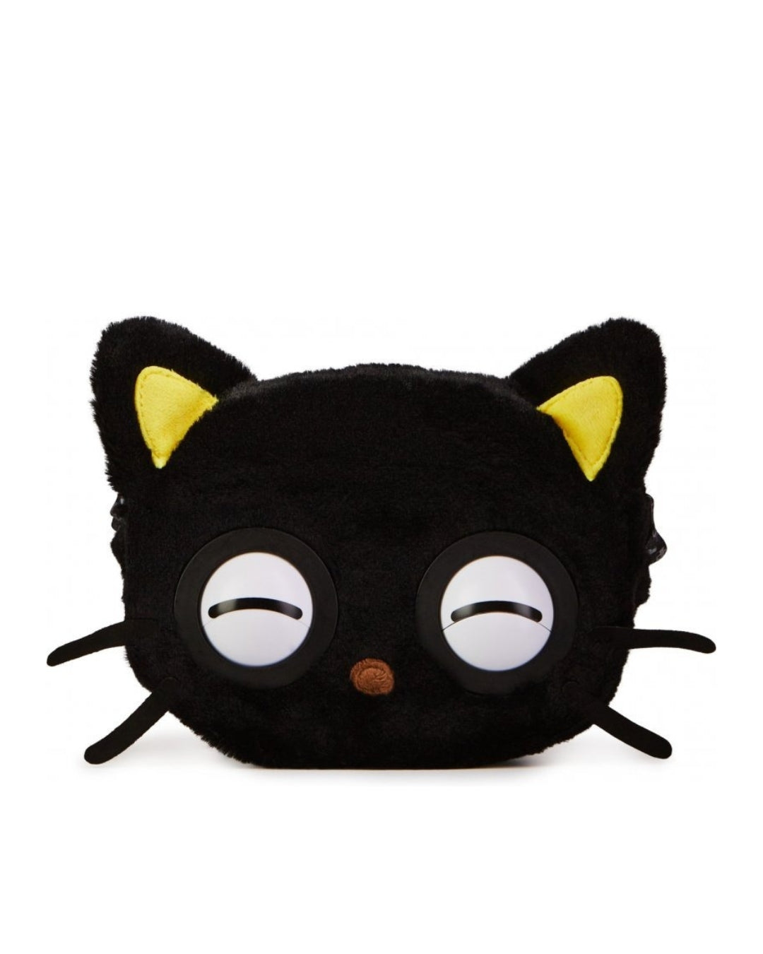 Meet Chococat, the savvy black cat from the Hello Kitty and Friends universe, whose whiskers serve as antennas to keep him well-informed! This cuddly Purse Pets plush bag brings Chococat to life with over 30 sounds, reactions, and catchy music when touched. Simply tap his forehead to see his big googly eyes open and close with an adorable silver gleam. Press his nose while holding his forehead to enjoy a musical stroll through the city, making fans feel like they're on a catwalk. Chococat even offers stylish advice through fun sounds, making him a favorite among older fans. Larger than standard Purse Pets and featuring a 107 cm strap suitable for heights up to 1.70 m, this plush bag includes a zippered compartment for your phone, wallet, keys, and essential beauty accessories—or even some chocolate to match Chococat's charm!