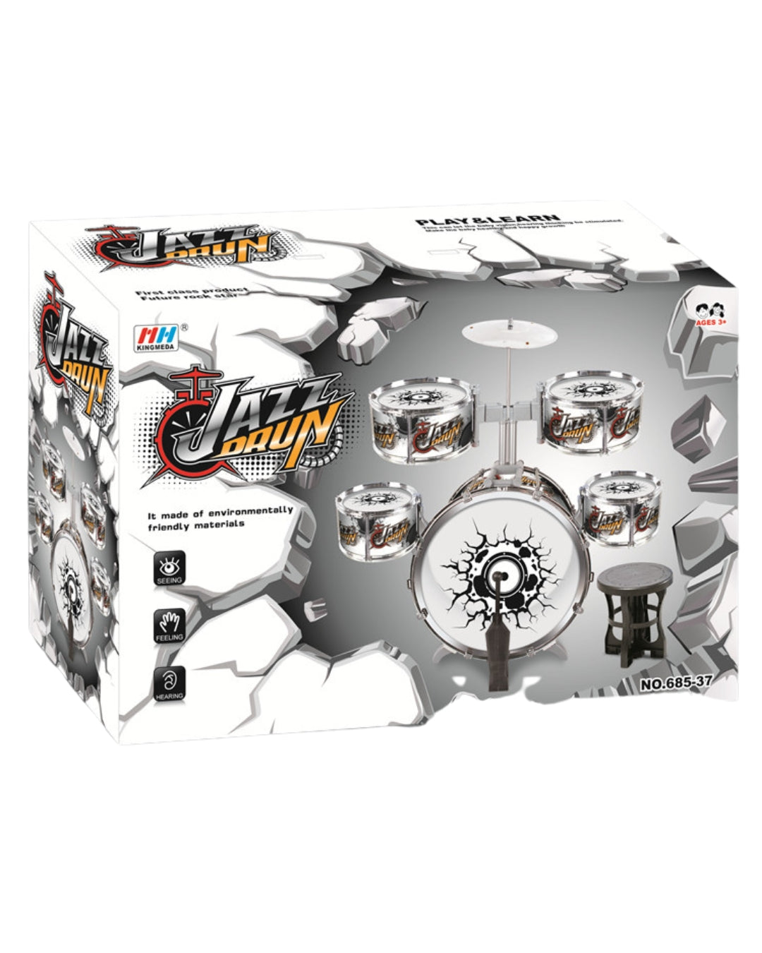 This jazz drum set for children is made from eco-friendly plastic and designed for easy, quick assembly with a stable foot support. The set includes multiple drums, a cymbal, a stool, and drumsticks, with durable drum heads that produce a crisp, loud sound for fun musical play.