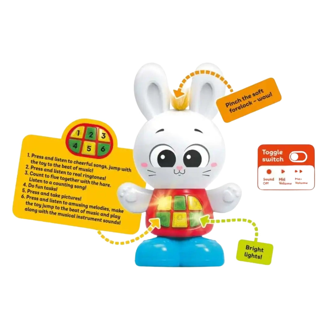 Meet the Baby Hoppers Hare, a lively and engaging toy packed with 25 funny sounds, melodies, and seven exciting activities that keep little ones entertained while learning. Featuring light-up buttons, a catchy counting song, and a touch-sensitive forelock that talks when pinched, this playful hare sparks curiosity and sensory development.