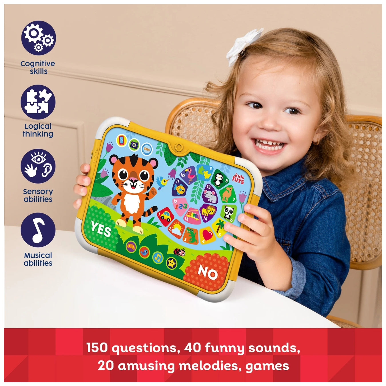 Make learning exciting with the Tiger Quiz Hit Pad from Kids Hits! This 9.5 x 7.2-inch interactive touch pad is designed to engage toddlers with fun games, quizzes, and melodies that teach about animals, nature, the human body, transport, and more. It’s a playful way to boost logic, memory, and early math skills.