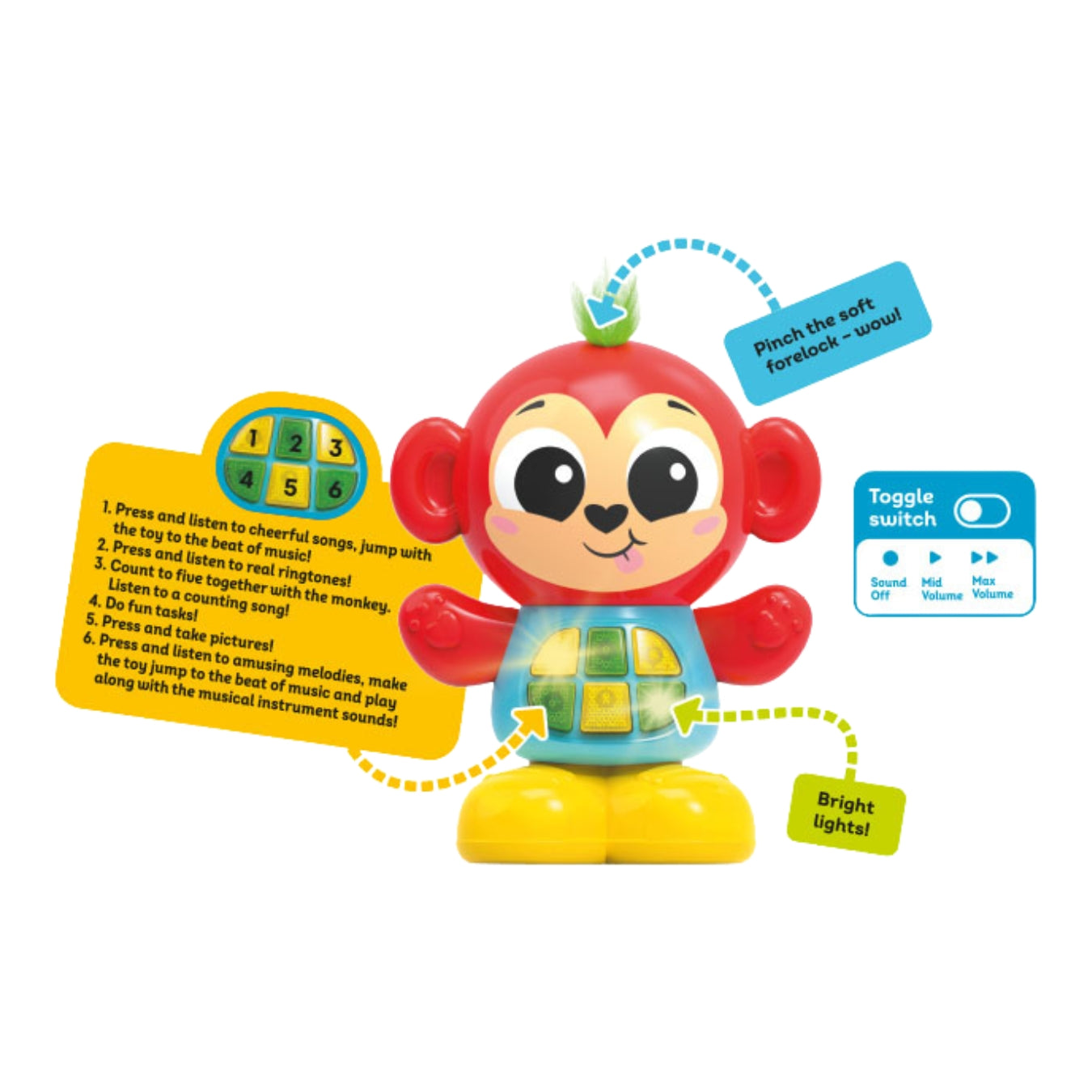 With 25 funny sounds and melodies, 7 engaging tasks, a counting song, and light-up buttons, this toy keeps kids entertained while helping them develop key skills. Thanks to its touch-sensitive forelock, just a gentle pinch makes the monkey talk adding surprise and delight to every interaction!