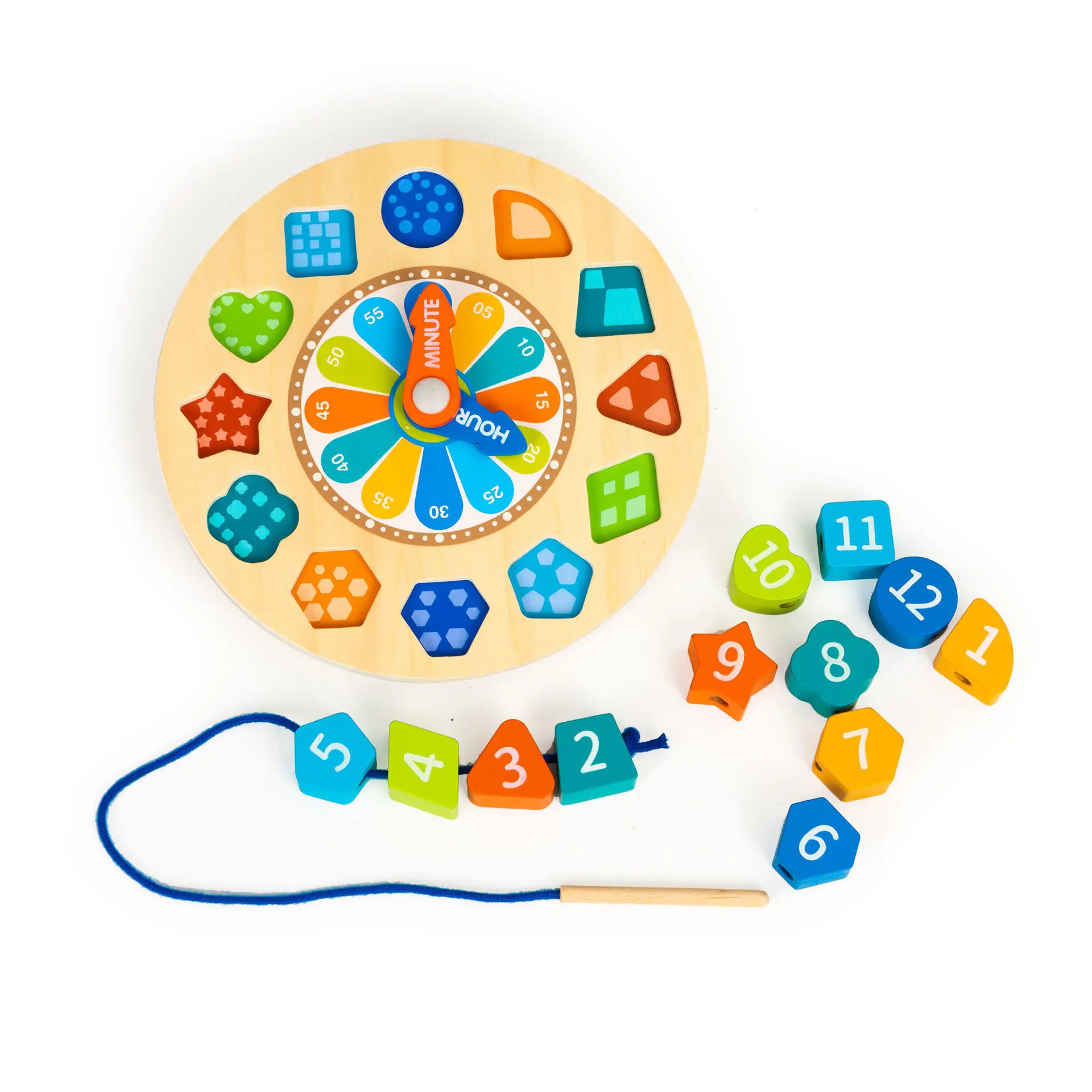 • Shape Sorting: The clock face doubles as a shape sorter, encouraging problem-solving and hand-eye coordination.