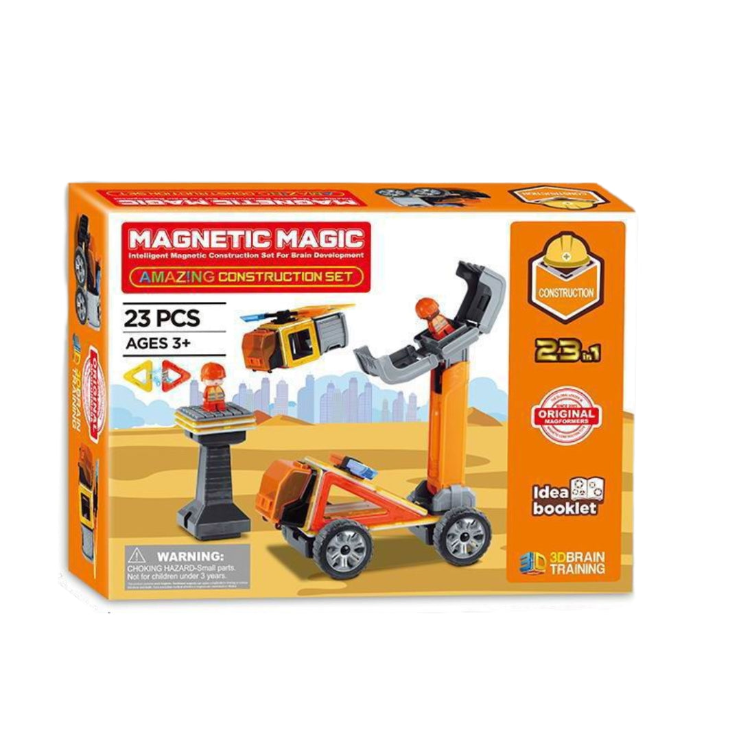 The Magnetic Magic Construction Set is an engaging toy suitable for children aged 3 and above, comprising 23 pieces like a construction vehicle, house, and fire station, aimed at fostering creativity, imagination, and problem-solving skills. This set is part of a series that provides hours of interactive play and learning, encouraging collection with the tagline.