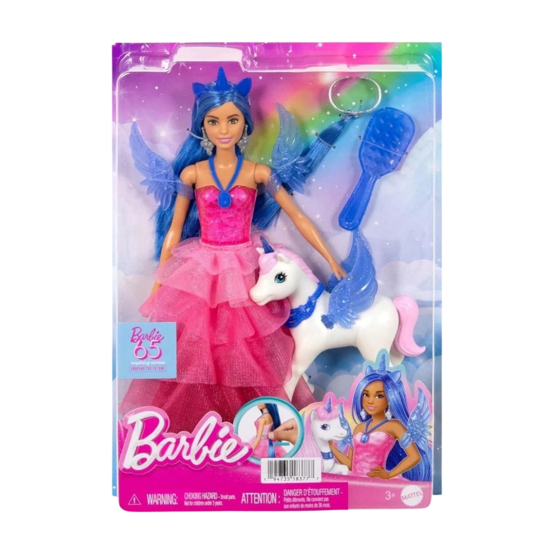 Celebrate Barbies 65th anniversary with the Mattel Blue Haired Doll, inspired by Barbie: A Touch of Magic. This special edition doll features sapphire blue hair, a vibrant pink dress, and enchanting accessories, offering endless opportunities for imaginative play, creative styling, and magical storytelling.