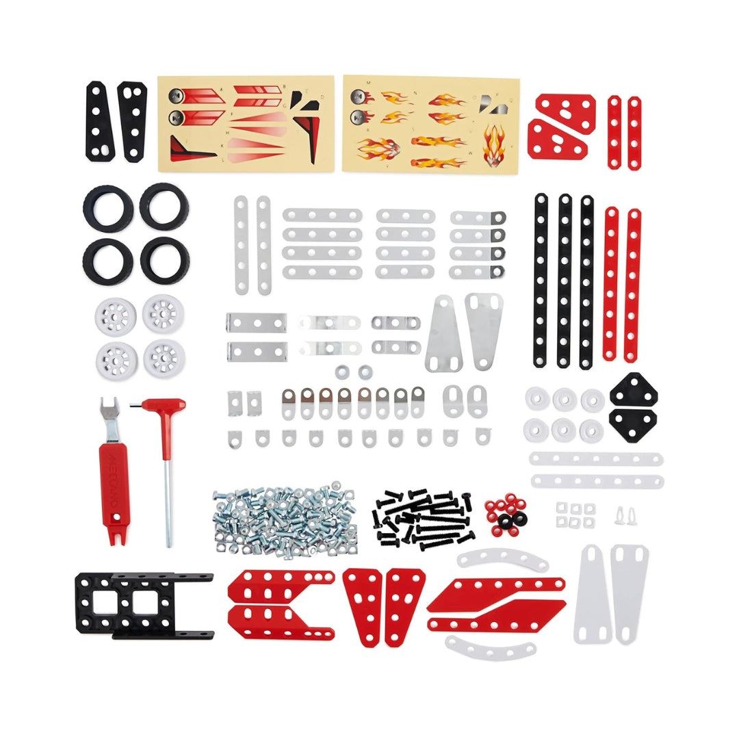 Build, race, and transform your creations with the Meccano 10-in-1 Racing Vehicles Set!