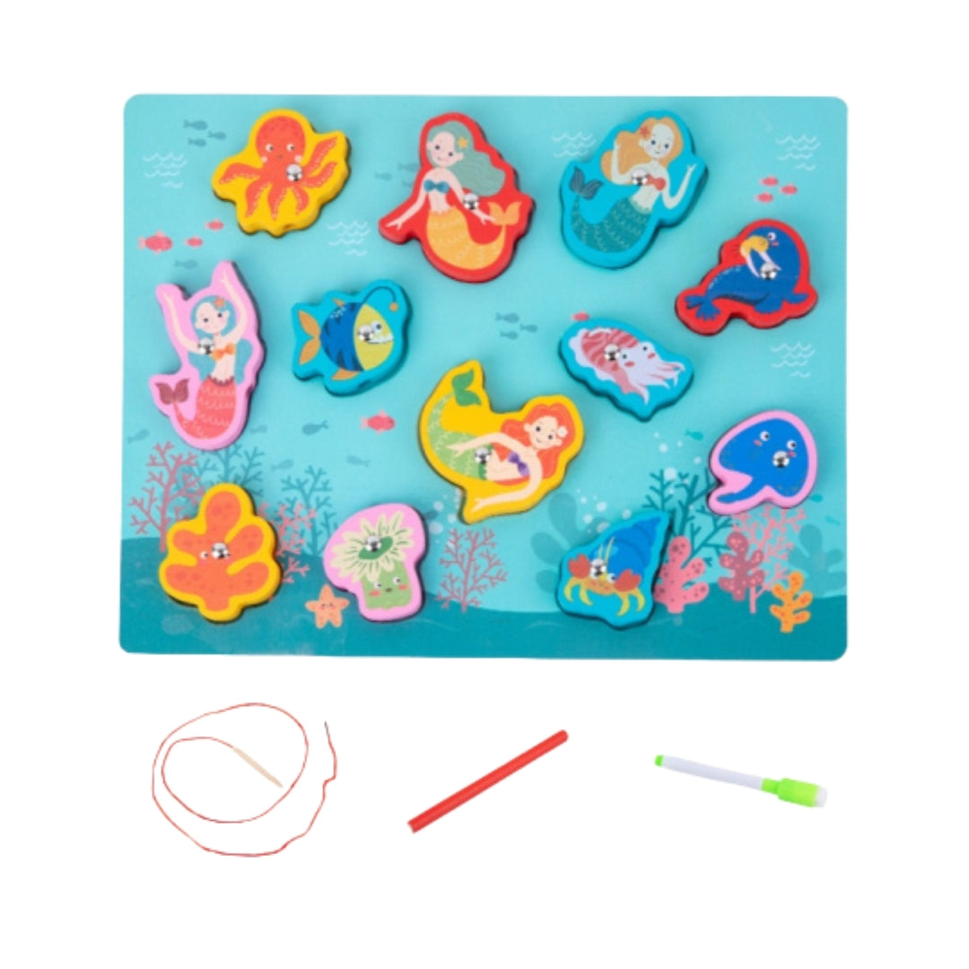 The Mermaid Double Sided Multi Function Board features the Magnetic Match: 3-in-1 Wooden Chunky Puzzle with vibrant sea creature artwork. Kids can use the magnetic fishing pole to catch colorful marine animals and then challenge themselves to place each piece back in its correct spot, combining fishing fun with puzzle-solving on both sides of the board.