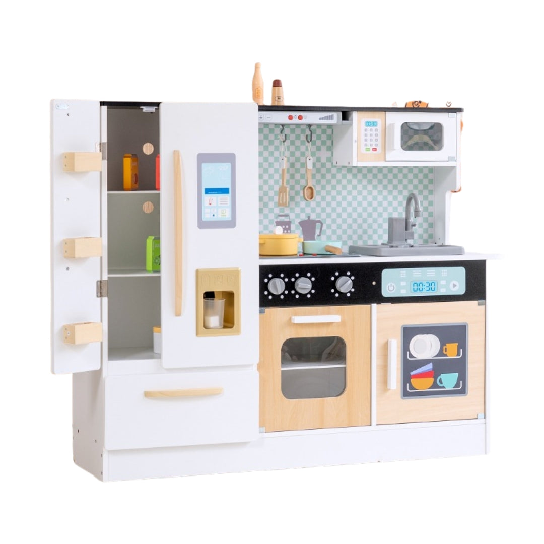 Let your child’s imagination run wild with this wooden kitchen and fridge set, designed for toddlers and young kids. It includes a working sink that “pours” water, a stove with glowing burners and sounds, a fridge with double doors and a drink dispenser, and lots of fun accessories for cooking and playing.
