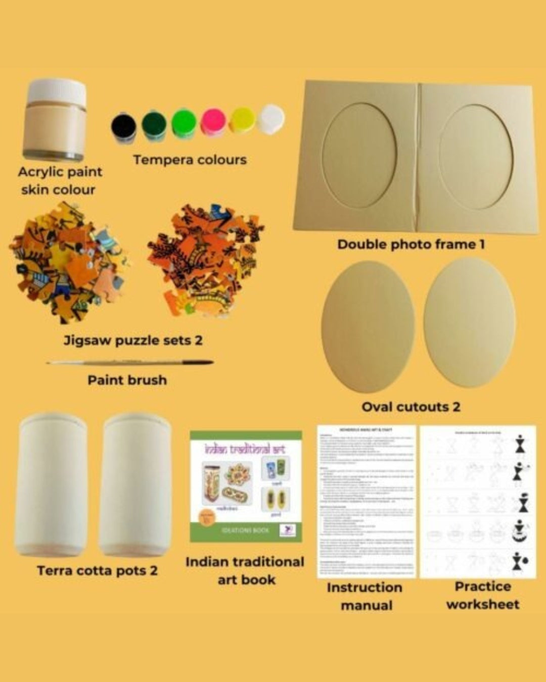 Embark on a creative journey with this comprehensive Toykraft kit that allows you to craft 5 stunning Warli-inspired articles and solve 2 intriguing picture puzzles! Immerse yourself in the captivating world of Indian traditional art with everything you need right at your fingertips.