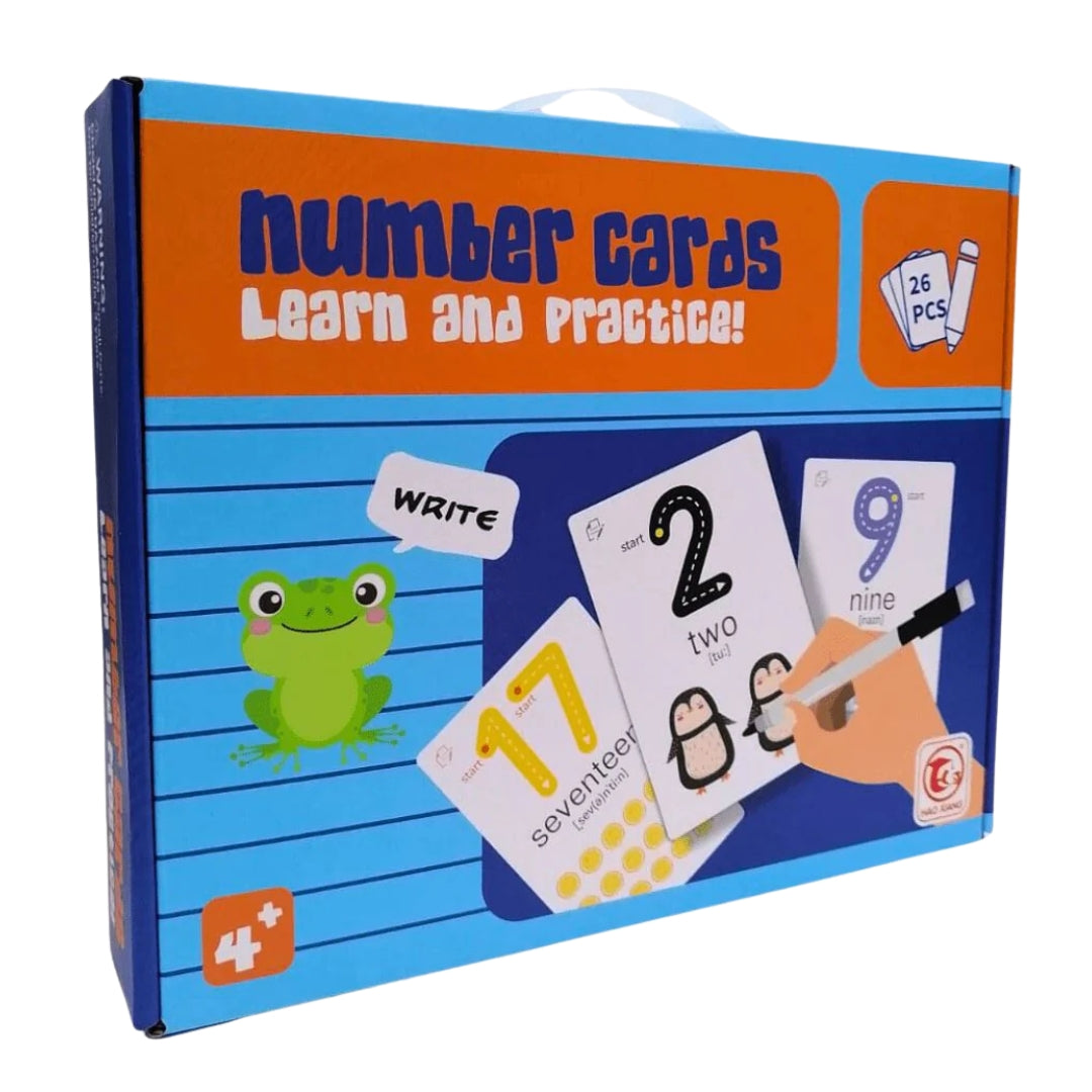 This educational set includes 26 number cards designed to help children learn how to write numbers. Each card features dotted lines for easy tracing and comes with a water-soluble erasable pen, allowing kids to practice again and again.