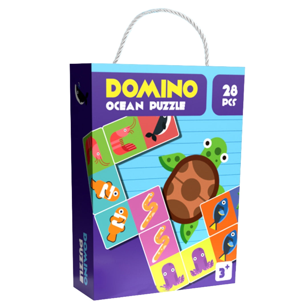 This set includes 28 sturdy cardboard dominoes featuring colorful ocean animals. Designed for children aged 3 and up, it helps improve memory, concentration, coordination, and problem-solving skills while introducing them to marine life.