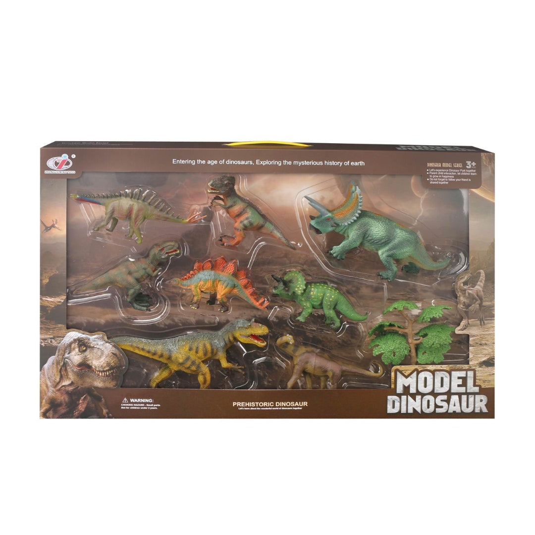 The Prehistoric Dinosaur Set features various dinosaur figures such as Tyrannosaurus Rex, Stegosaurus, Brachiosaurus, Triceratops, Pterodactyl, and Velociraptor, providing an immersive play experience that delves into the ancient world of dinosaurs.