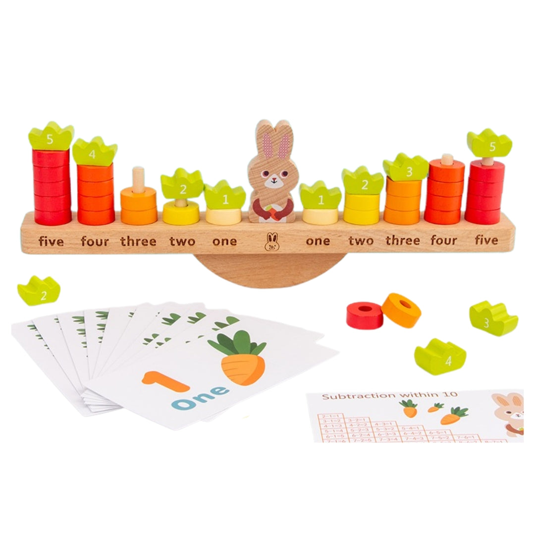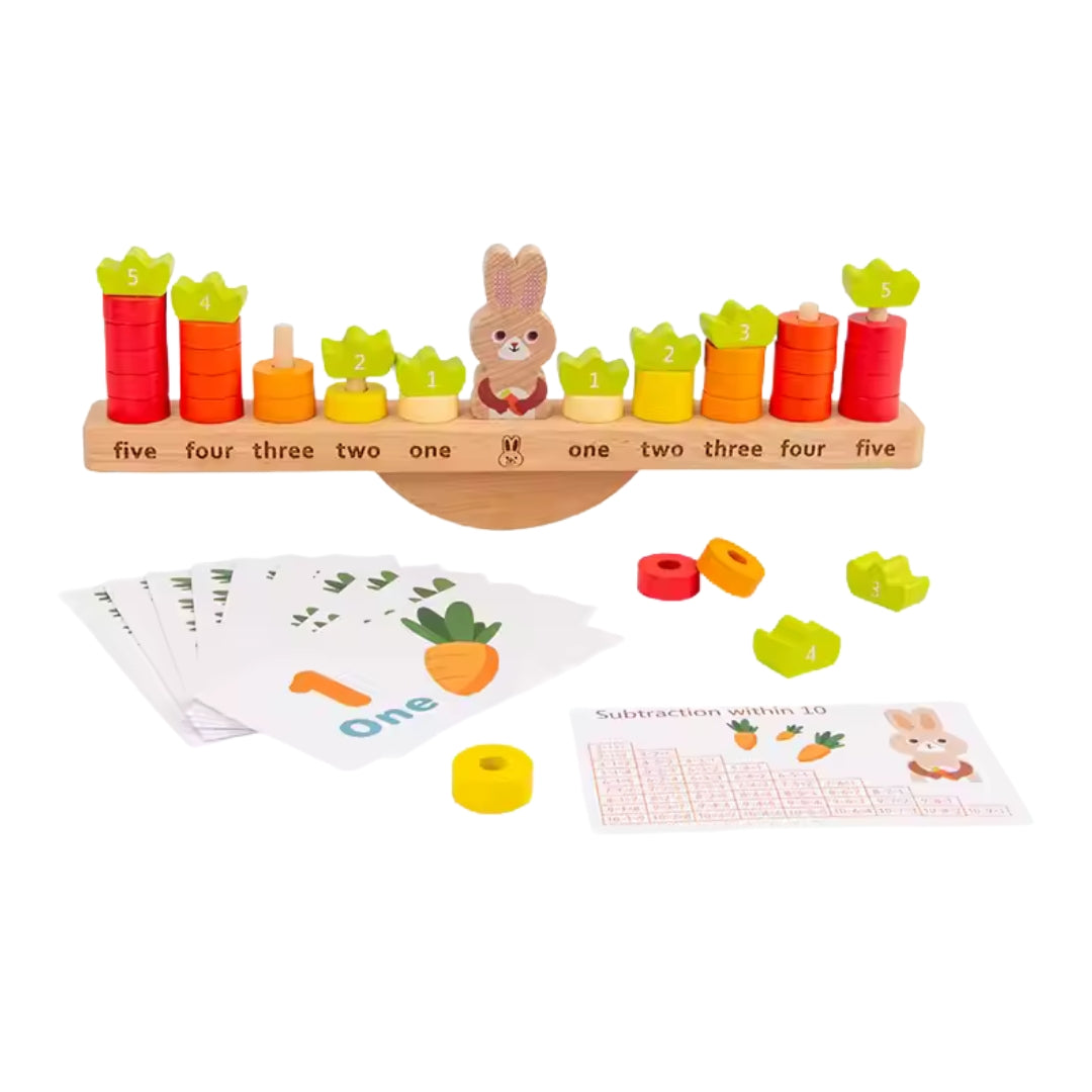 Make learning math fun with the Rabbit Balance, a wooden educational toy that helps children explore counting, number recognition, and basic subtraction through interactive, hands-on play. This charming set features a rabbit-themed balance scale, numbered wooden blocks, and illustrated cards with playful visuals like carrots to reinforce early math concepts.