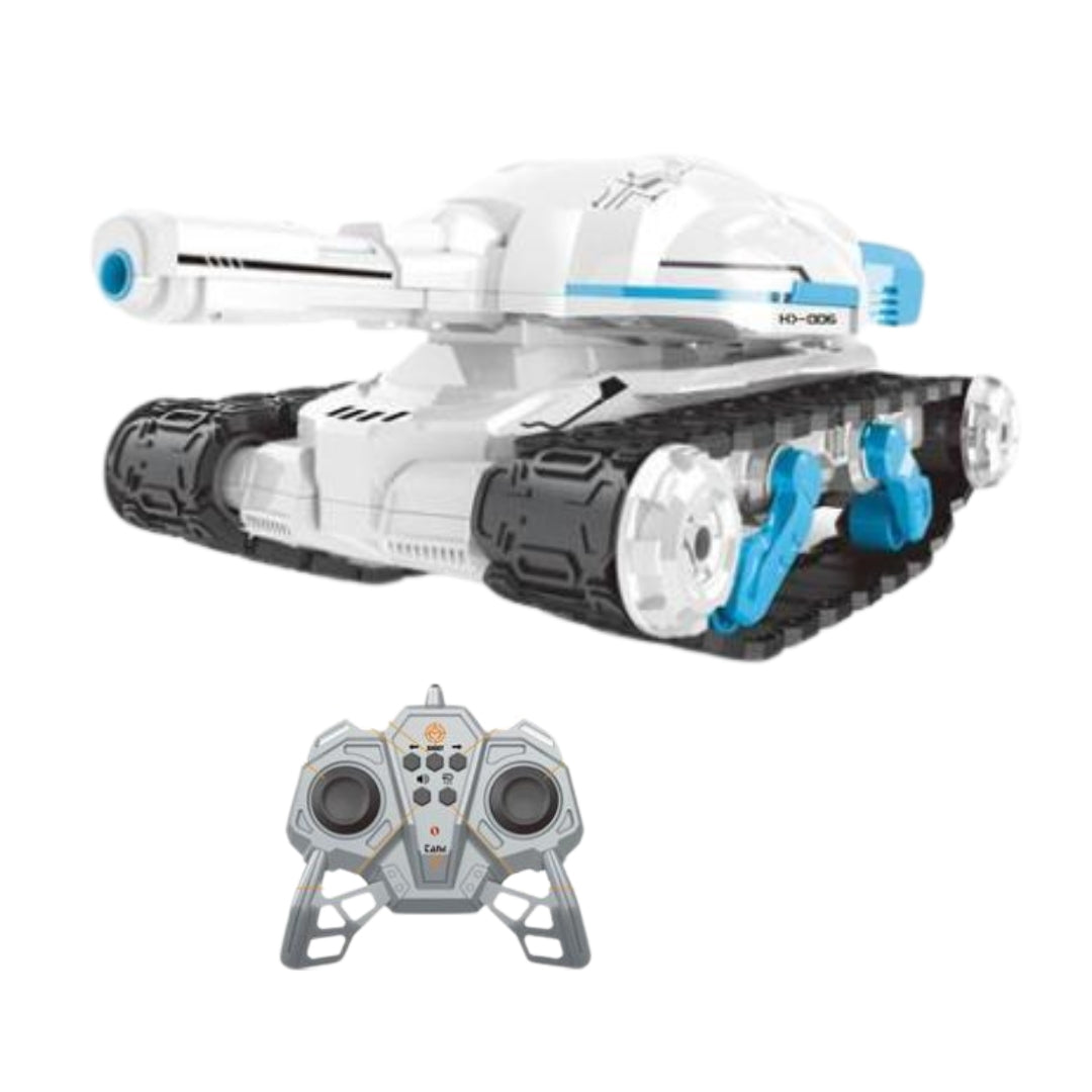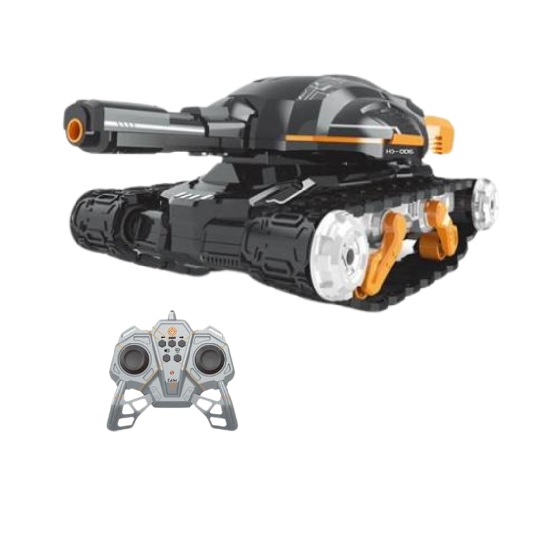 Description for a website: RC Shooting Tanks with 2.4G control, featuring forward, backward, and left/right turning capabilities, powered by a 3.7V battery, requiring 2 AAA batteries for the watch and 2 AA batteries for the remote control (batteries not included).