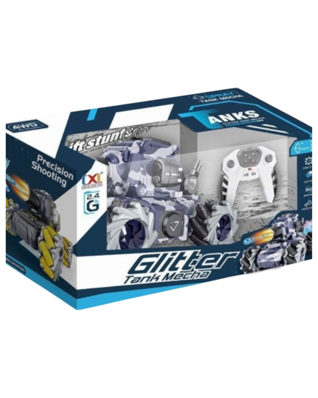 This Glitter Tank Mecha remote-control vehicle features multidirectional stunt driving with advanced Mecanum wheels and 4WD power. It can rotate 360 degrees, shoot water gel balls, and is operated with a 2.4G remote controller for smooth, responsive control.