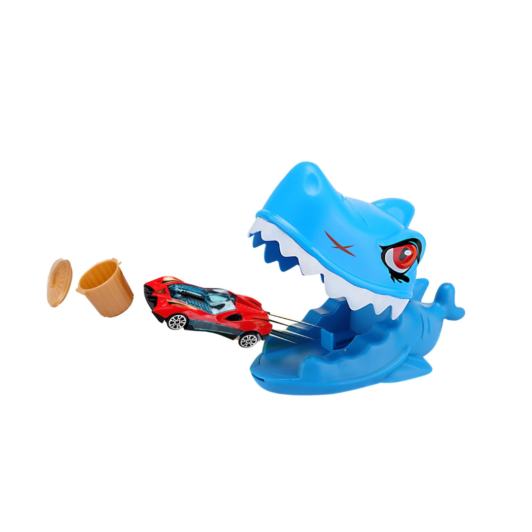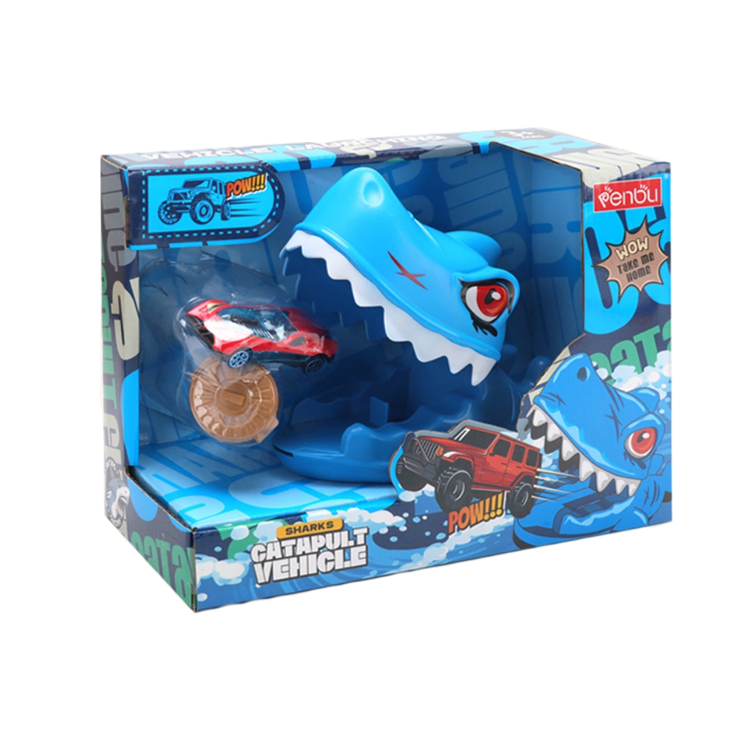 This toy set features a shark-shaped catapult vehicle, with a playful representation on the box showing the head of a rhinoceros and the text "shark Catapult Vehicle." The packaging suggests that it is a product designed for children's imaginative play, likely with themes of wildlife and adventure.