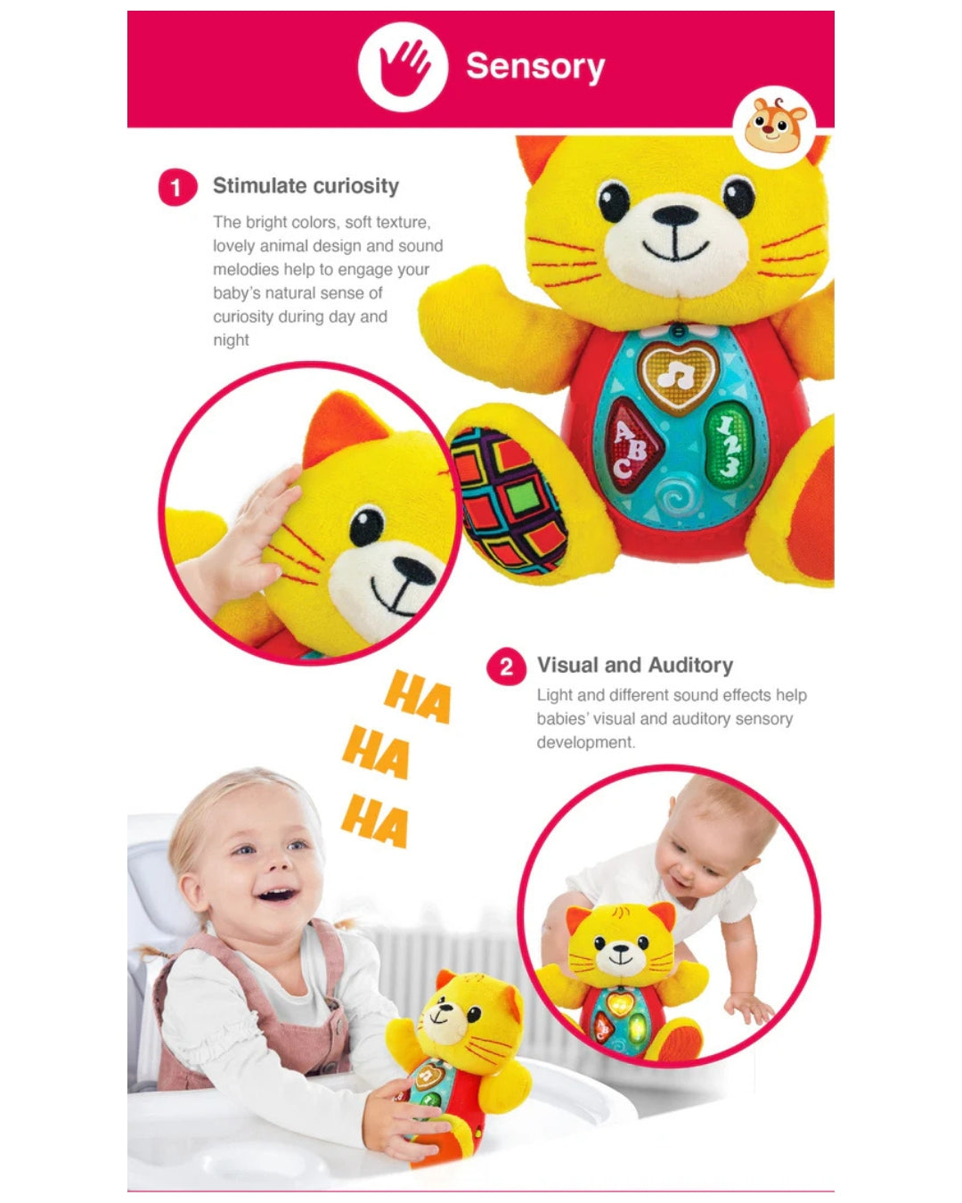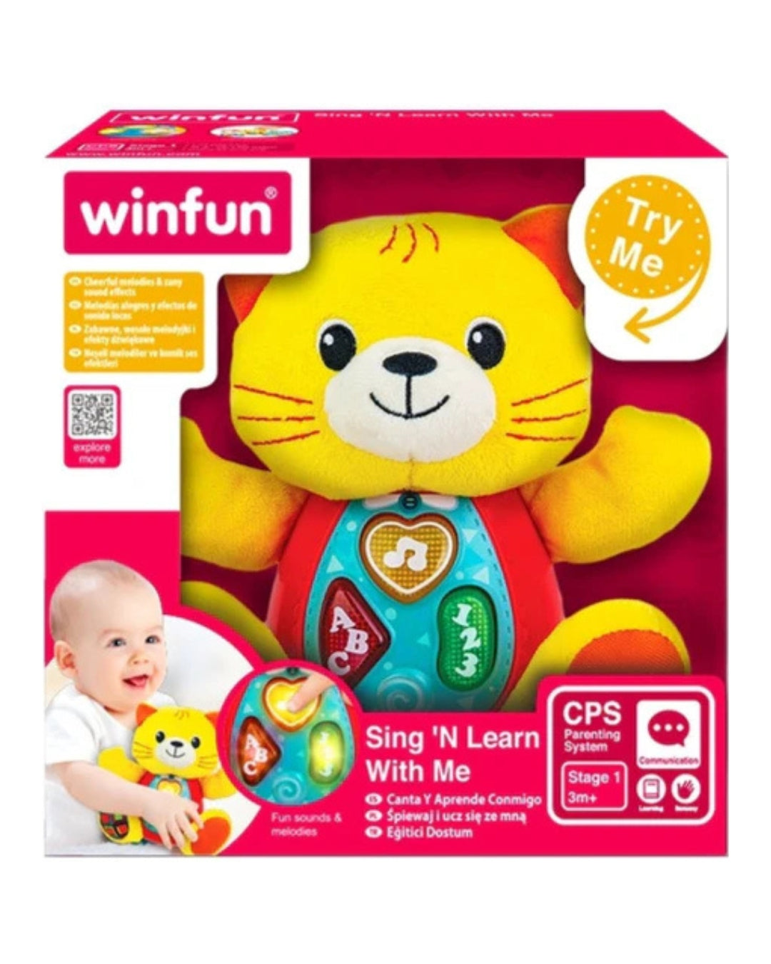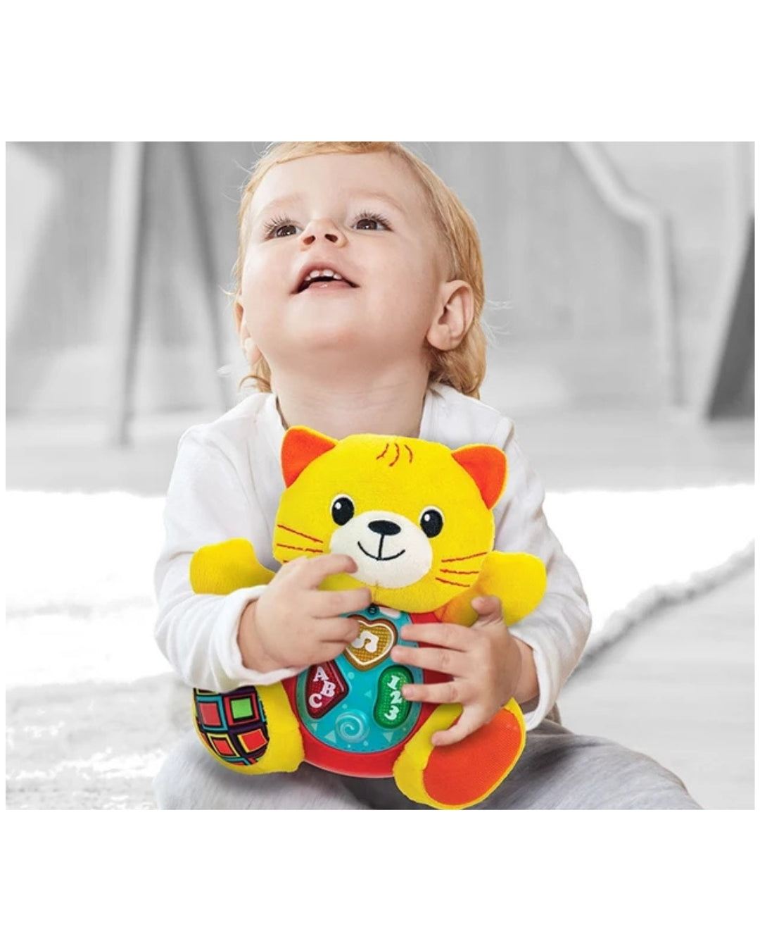 Sing 'N Learn With Me Kelsey Cat is a playful and interactive toy that entertains while teaching simple concepts. Press any of the three light-up buttons to hear rhyming phrases, cheerful melodies, and zany sound effects.