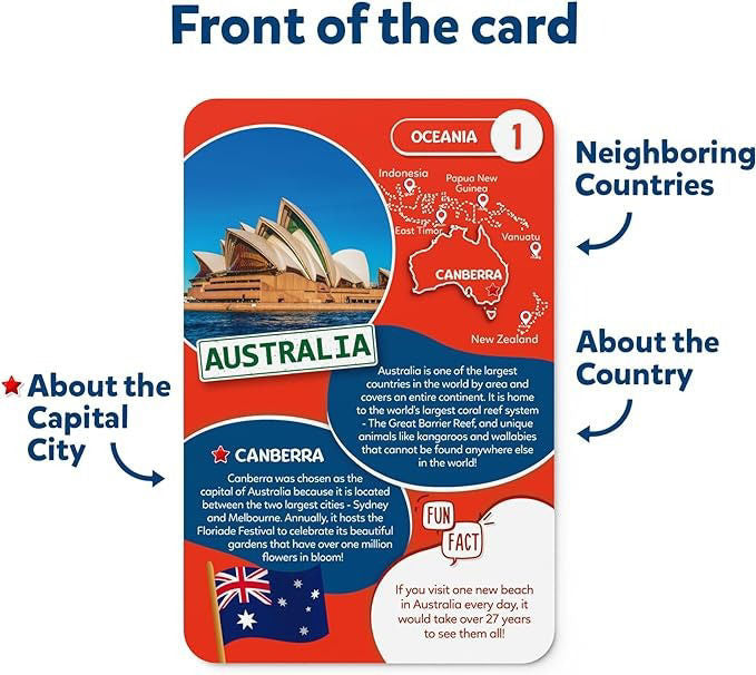 Learn about their capitals, unique characteristics, and more! Interactive learning: The color-coded continents and cards make matching and learning about different countries and their capitals easy and engaging.