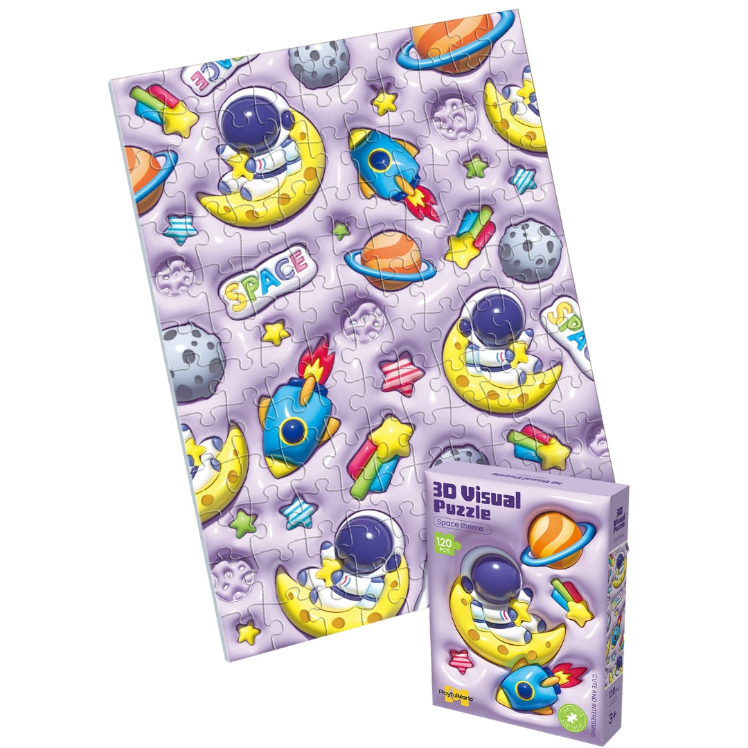 Explore the wonders of the universe with this 3D space-themed puzzle, featuring astronauts, planets, rockets, and stars. With 120 pieces, it challenges children to assemble a visually engaging 3D scene, promoting focus, hand-eye coordination, and logical thinking. Perfect for young space enthusiasts, this puzzle combines fun and education while encouraging problem-solving and spatial awareness skills.